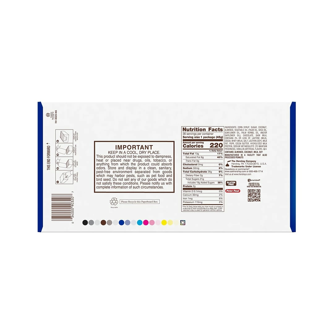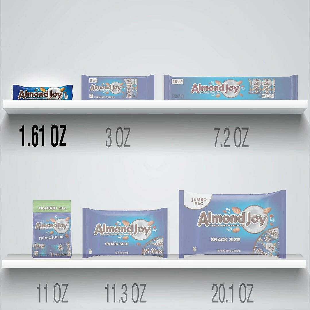 Contains thirty-six (36) 1.61-ounce ALMOND JOY Coconut and Almond Chocolate Candy Bars