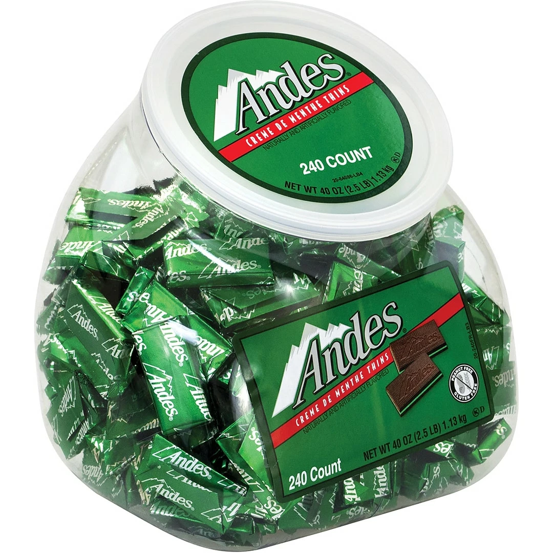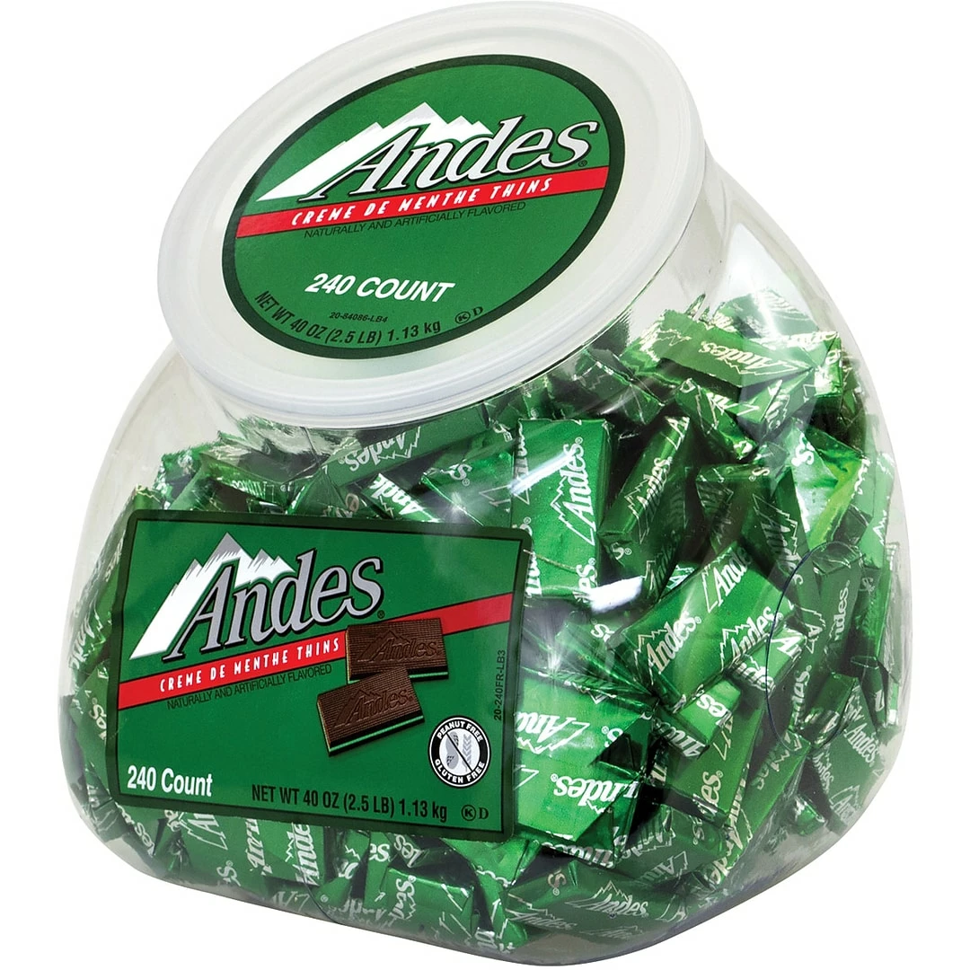 A 240-Piece resealable candy jar of Andes Creme de Menthe individually wrapped Chocolate Mints