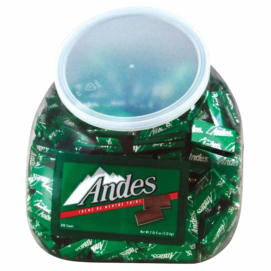 Andes creme de menthe thins are made with a creamy fusion of chocolate and mint. These mini candies are individually foil-wrapped to preserve their wonderful taste/aroma. The tub is ideal for after-dinner or for parties. One tub contains 240 pieces.