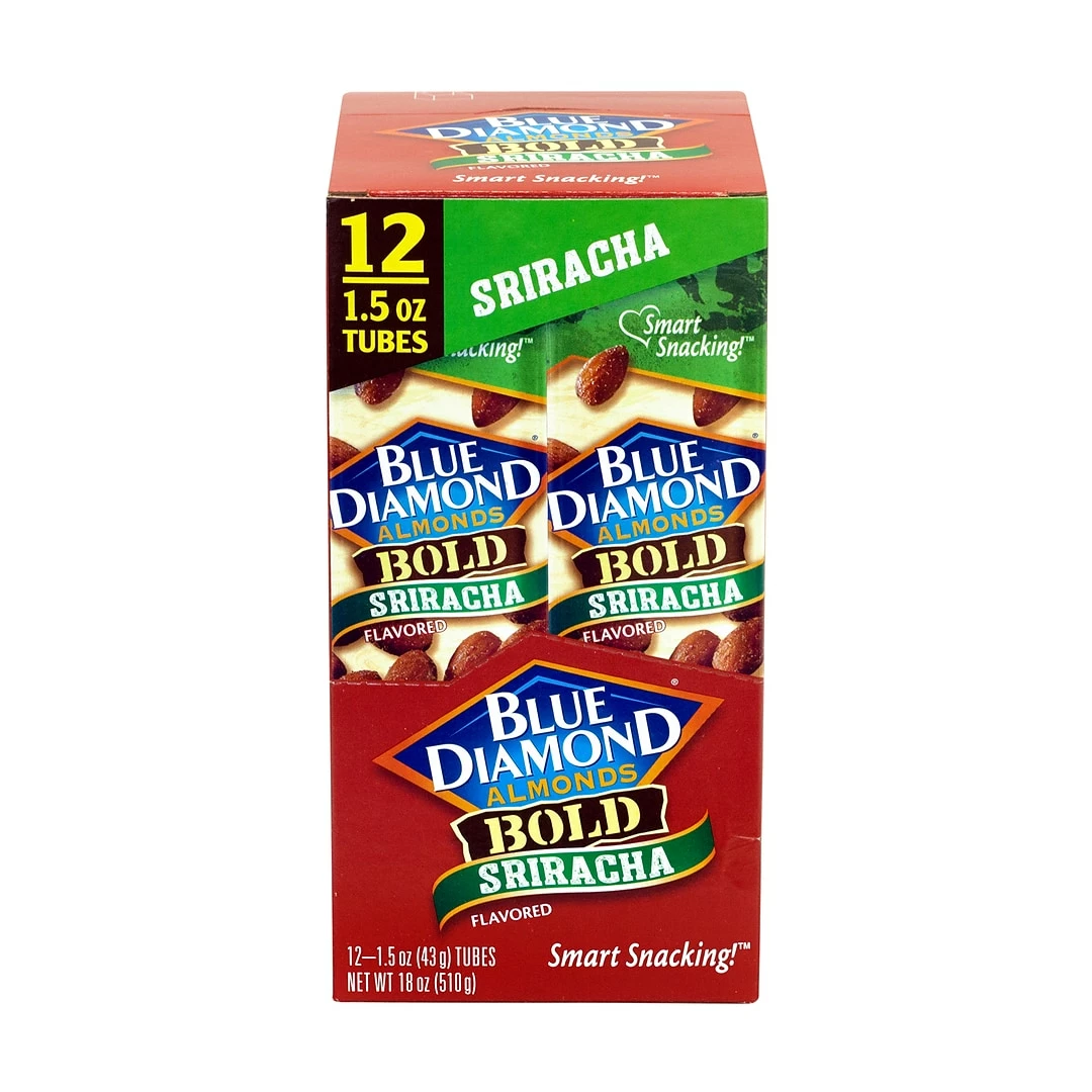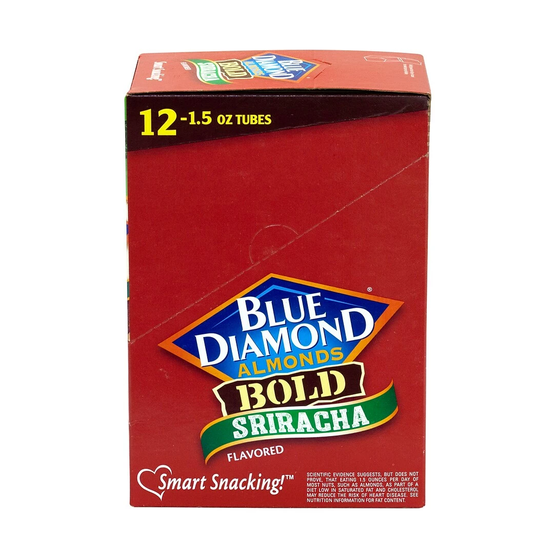 A 12 count box of Blue Diamond Almonds with a bold Sriracha flavor