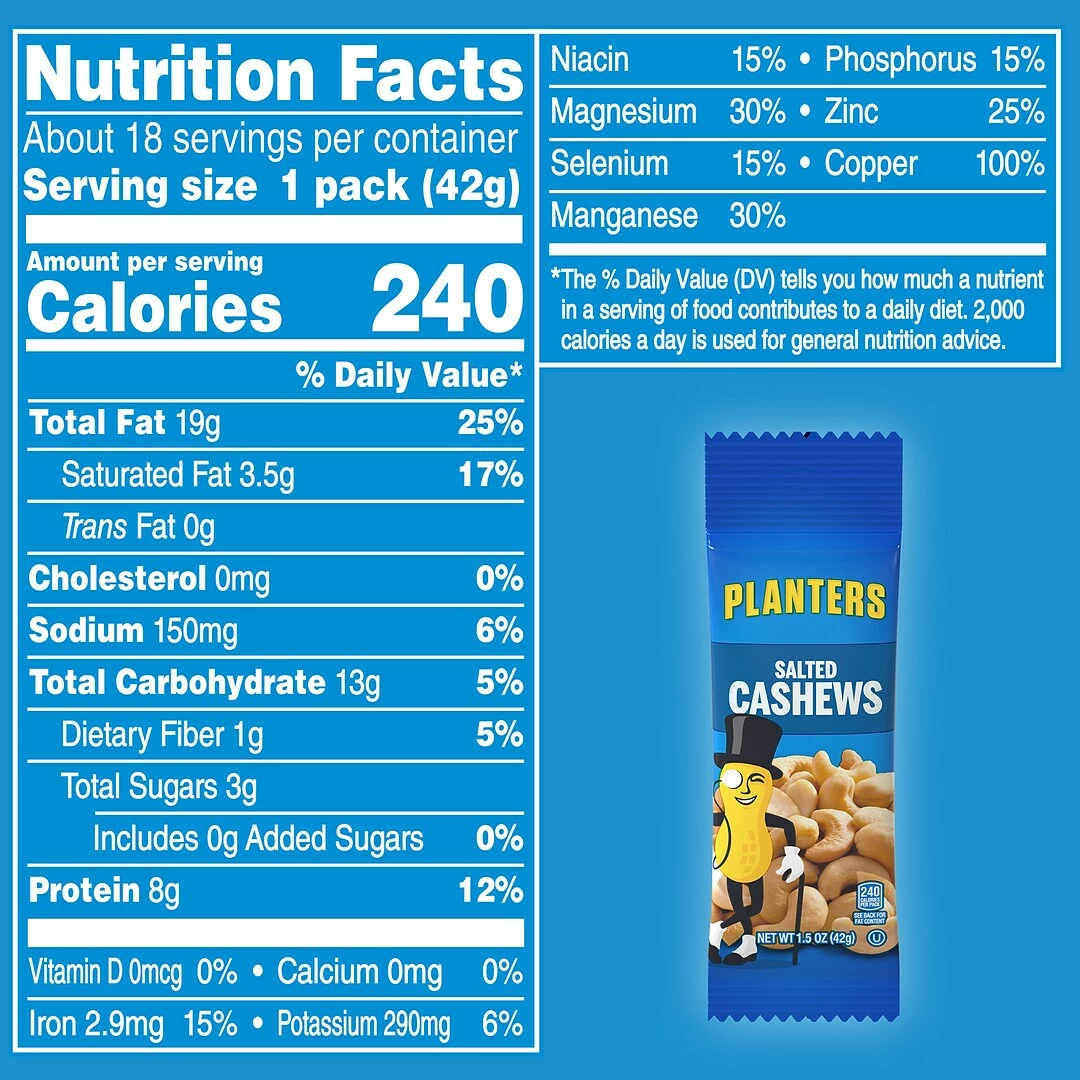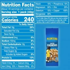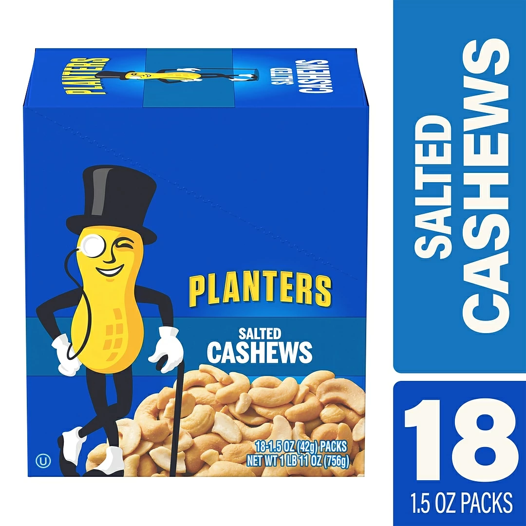 These pouches of cashews are perfect for eating on-the-go, in between meetings, or when you’re lounging around the house! Planters Salted Cashews, 1.75 oz, 18 Count are bursting with deliciously crunchy flavor. Each box contain eighteen 1.75 ounce pouches of Salted Cashews.These Kosher cashews are a great alternative to sugary or unhealthy snacks. Planters Salted Cashews, 1.75 oz, 18 Count is a must have for the office break room, or packed in your lunch each day for a protein-packed cashew snack!