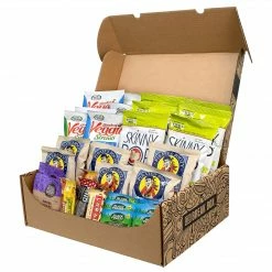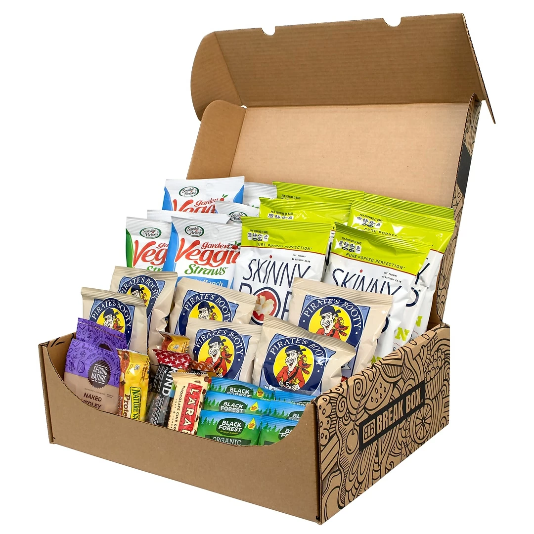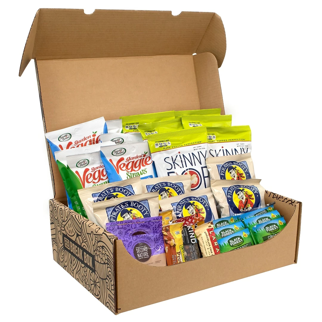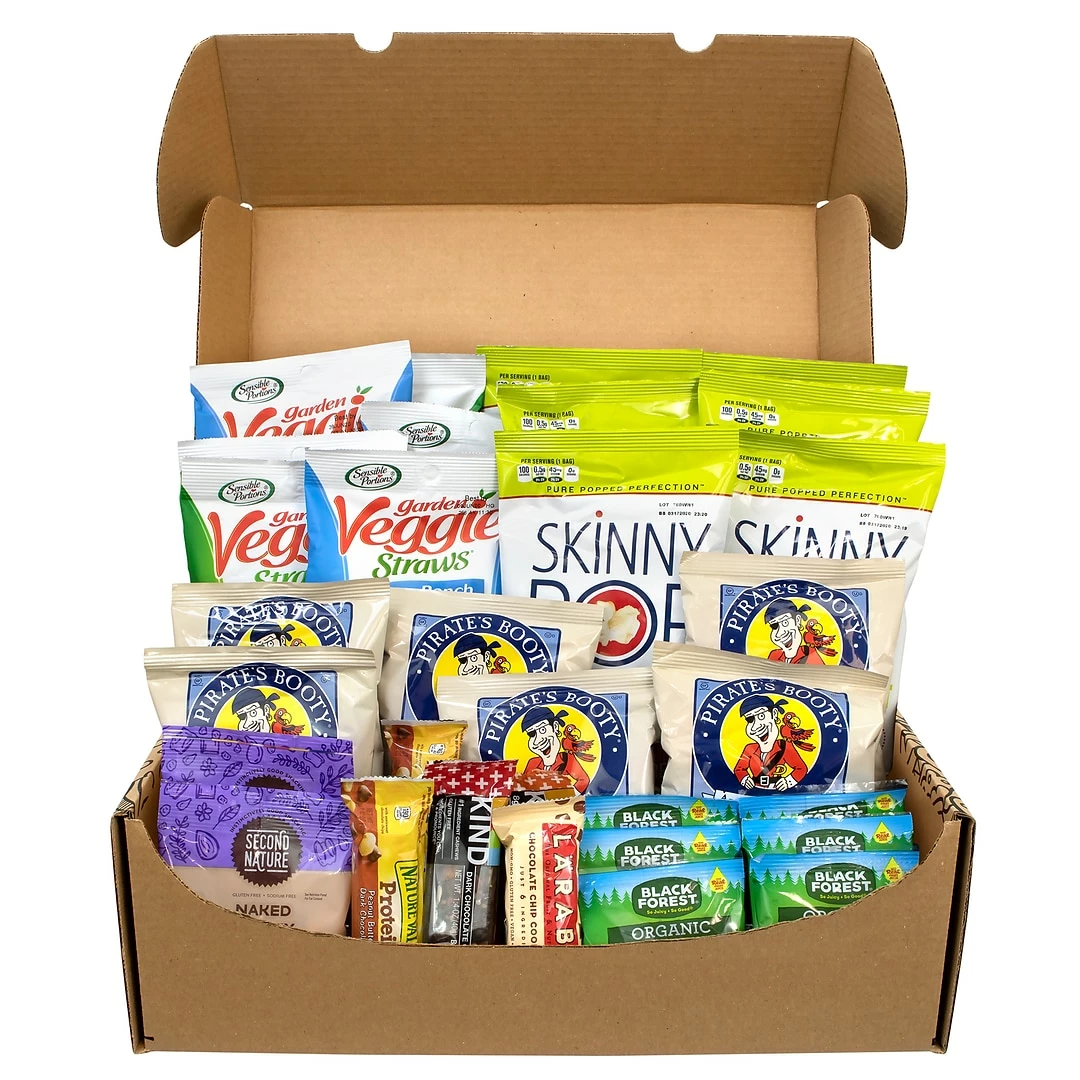 Each box contains: six Skinny Pop 100 Calorie, six Sensible Portions Veggie Straw, six Pirates Booty, two Second Nature Naked Medley, one Kind Nuts & Spices Bars Variety, one Brookside Dark Chocolate Fruit & Nut Bars, three Nature Valley Protein Granola Bars, one Larabar Variety, six Welch’s Mixed Fruits Snacks