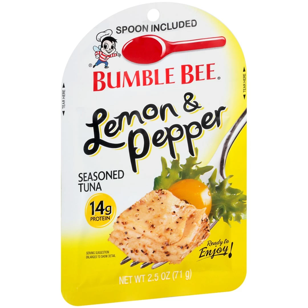 2.5 oz Lemon Pepper flavored tuna pouch with a spoon.