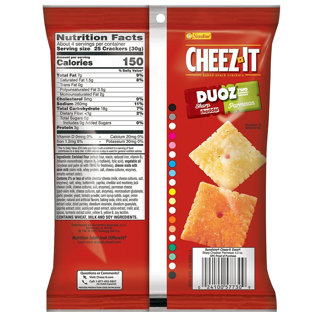 Cheez-it Duoz is the combination of two tasty salty snack crackers made with 100% real cheese to satisfy any salty snacking occasion with a unique combination of two cravable Cheez-it flavored crackers