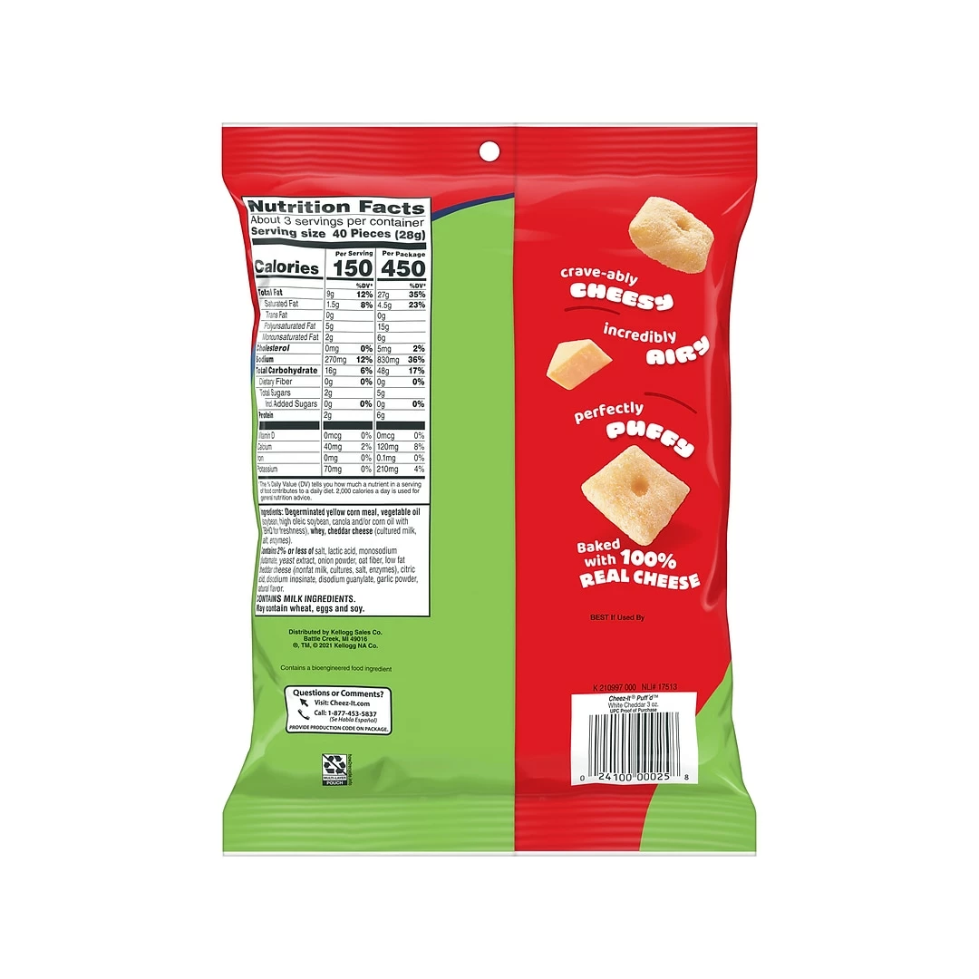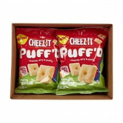 Taste the fun of puffy and airy bite-size squares baked with 100% real cheese inside and out. The Cheez-It Puff’d White Cheddar cheesy baked snack brings you creamy, cheddary flavor in every bite. This snack satisfies your senses with an irresistible crunch followed by melt-in-your-mouth cheesiness that everyone is sure to crave. Baked with 100% real cheese in every puffy cracker for maximum tastiness. Grab a pouch for a fun and light meal, an afternoon pick-me-up or on-the-go bite. Enjoy the crisp, crunchable, and always munchable Cheez-It Puff’d cheesy baked snack.