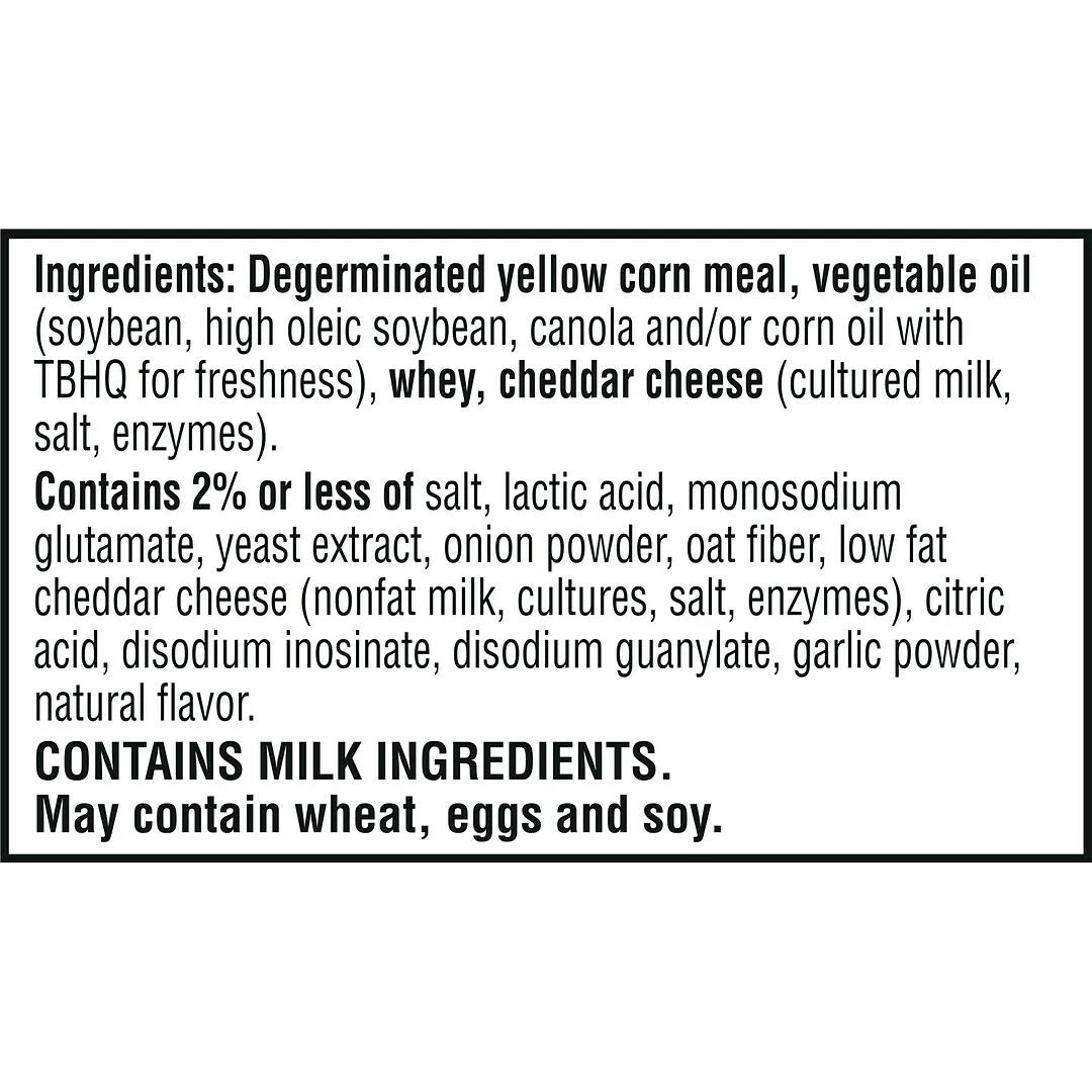 Ingredients: enriched flour, vegetable oil (soybean and palm oil with TBHQ for freshness), white cheddar cheese (milk, cheese cultures, salt, enzymes), contains 2% or less of salt, whey, cheddar cheese (milk, cheese cultures, salt, enzymes), monosodium glutamate, whey protein concentrate, butter, baking soda, yeast, natural and artificial flavor, lactic acid, calcium lactate, disodium phosphate, citric acid, turmeric extract color, annatto extract color, soy lecithin