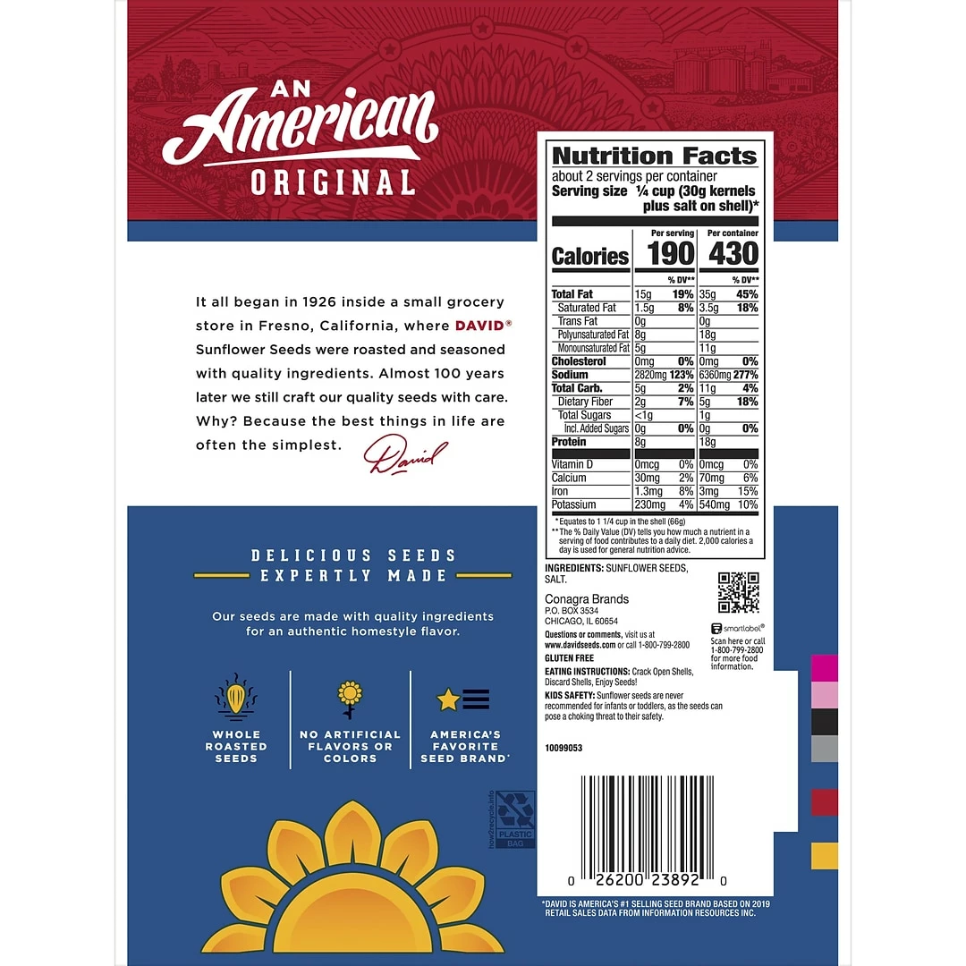 The roasted and salted sunflower seeds in this David Jumbo Seeds Original, 5.25 oz, 12 Count are still the same flavor and quality of the David seeds you’ve been enjoying for years. Quality seeds, roasted and seasoned to perfection! This 12 pouch case is bursting with salted sunflower seeds in 5.25 ounce reasealable bags. Great for snacking on in the office or sharing with coworkers, these David Sunflower Seeds are grown for greatness. David Jumbo Seeds Original, 5.25 oz, 12 Count let you bring the classic ballpark seed taste and bring them wherever you want a crunchy, salty treat!