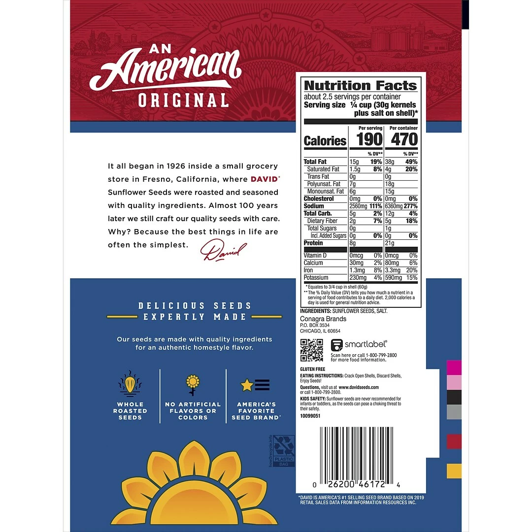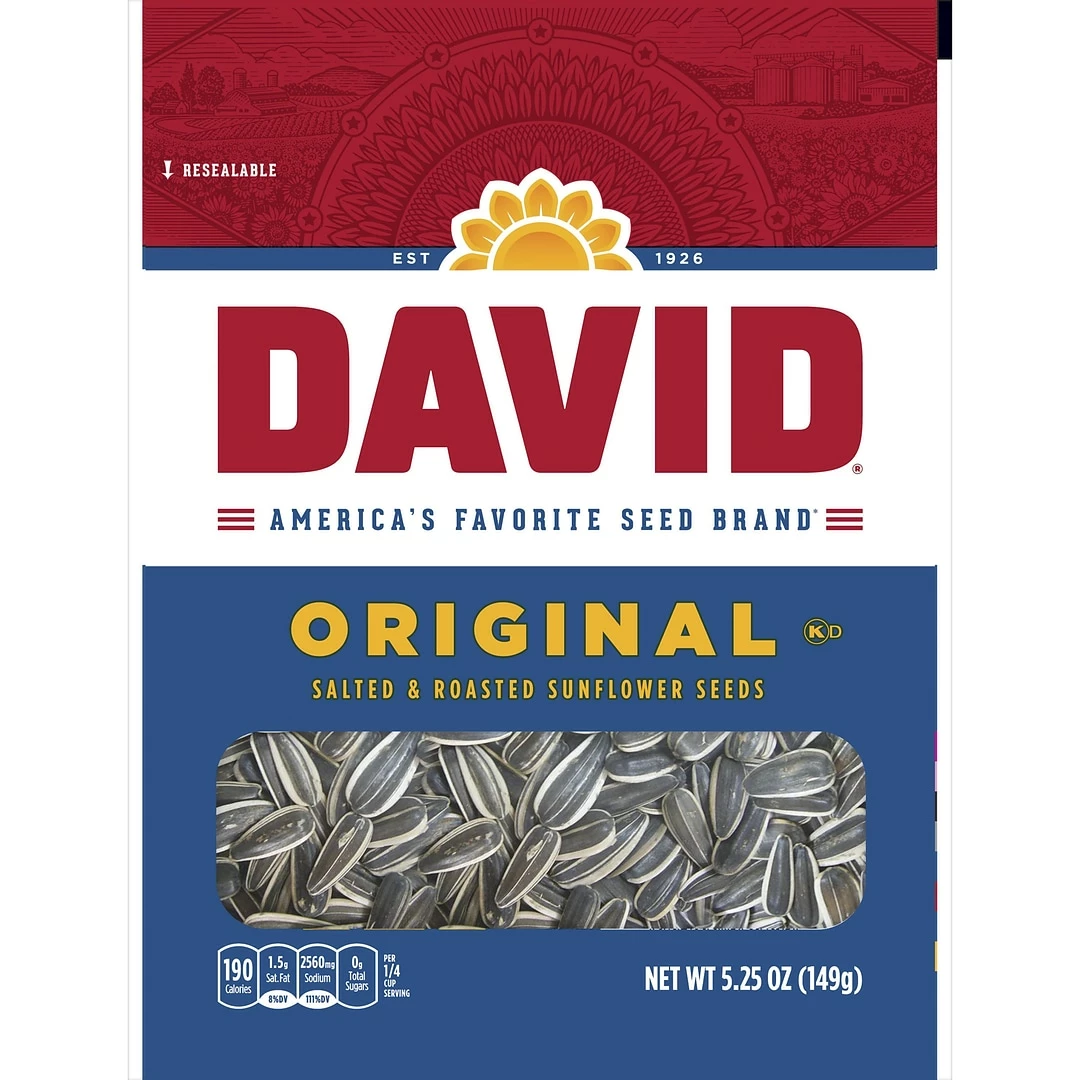 Grab a pack of DAVID Original Sunflower Seeds for a satisfying snack to help you stay in the game when every minute counts. DAVID Seeds are a delicious, and crunchy bite on the go. Best served anywhere and anytime, these handy to-go snacks are easy to carry for those moments when hunger strikes. Each 5.25 oz Pack contains about 2.5 servings, with 190 calories, 8 grams of protein, and 2 grams of fiber, as well as 10% of your daily allowance of Vitamin E, 25% of phosphorus, and 30% of magnesium per serving. Since 1926, DAVID Seeds provides a quality difference that you can taste with select top-quality seeds, roasted and seasoned to perfection. This Pack contains twelve 5.25 oz bags of DAVID Original Sunflower Seeds, great for group and solo snacking.