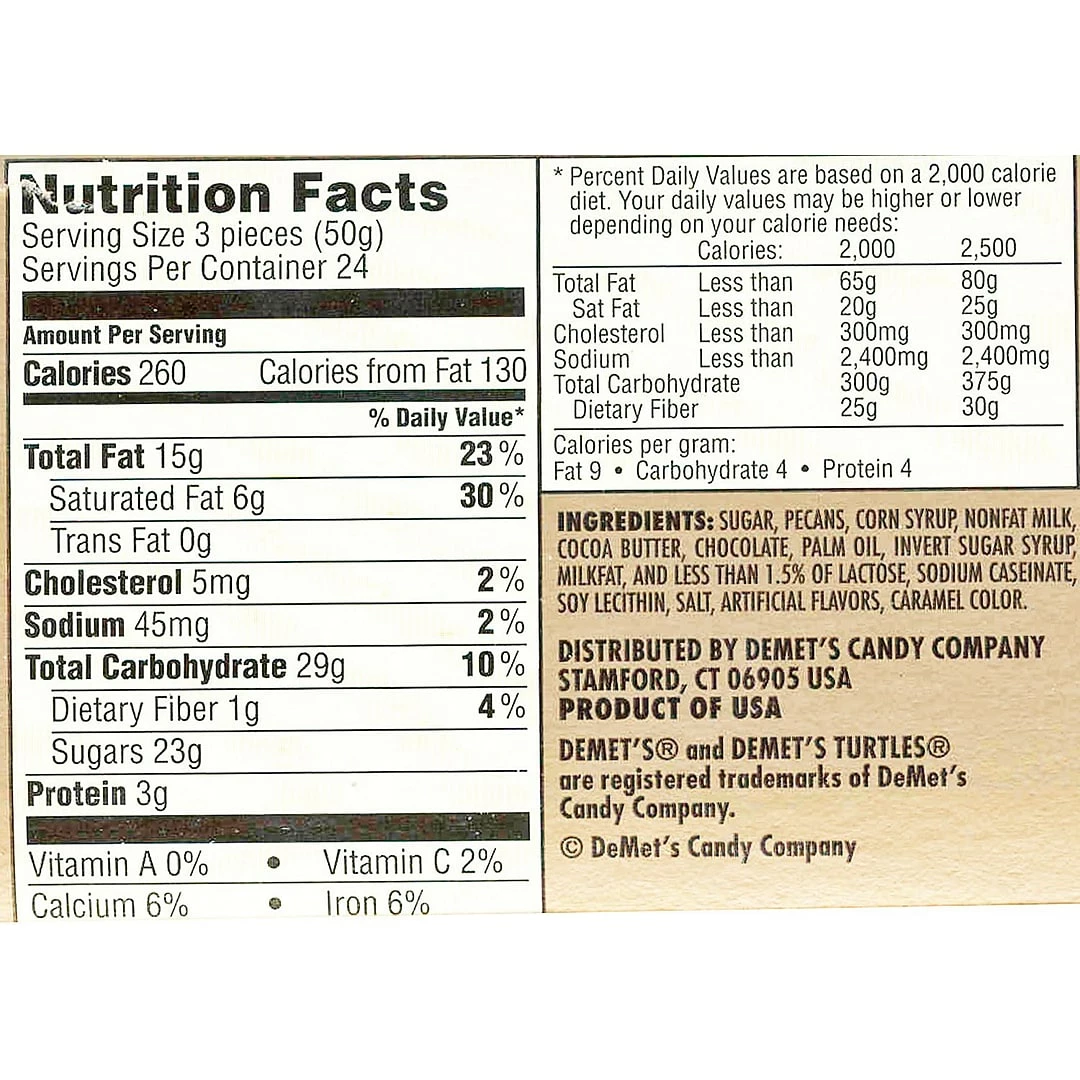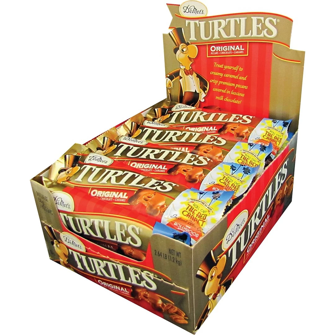 Demet’s® Turtles® Chocolate covered pecans in caramel flavor are very delicious to taste. Chocolate covered pecans are stuffed in a 1.76 oz pack and are ideal for fun parties, sold as 24 packs per box.