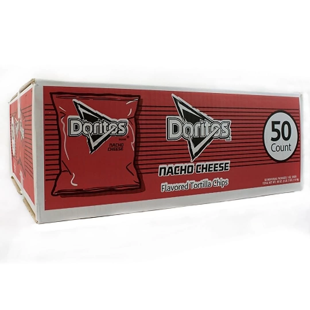 Bring some excitement to your snack time with Doritos nacho cheese chips. These zesty and crunchy tortilla chips are flavored with cheddar, nacho and romano cheese to bring a delicious flavor punch to your mouth. Enjoy a low cholesterol snack with a cheesy spice dusting. Each box contains 50 individual 1 oz bags. Crunch your way through these Doritos nacho cheese bags during lunch time at the office, or grab a bag while on the go. salt, enzymes), whey protein concentrate, onion powder, corn flour, natural and artificial flavor, dextrose, tomato powder, lactose, spices, artificial color (including yellow 6, yellow 5, and red 40), lactic acid, citric acid, sugar, garlic powder, skim milk, red and green bell pepper powder, disodium inosinate, and disodium guanylate
