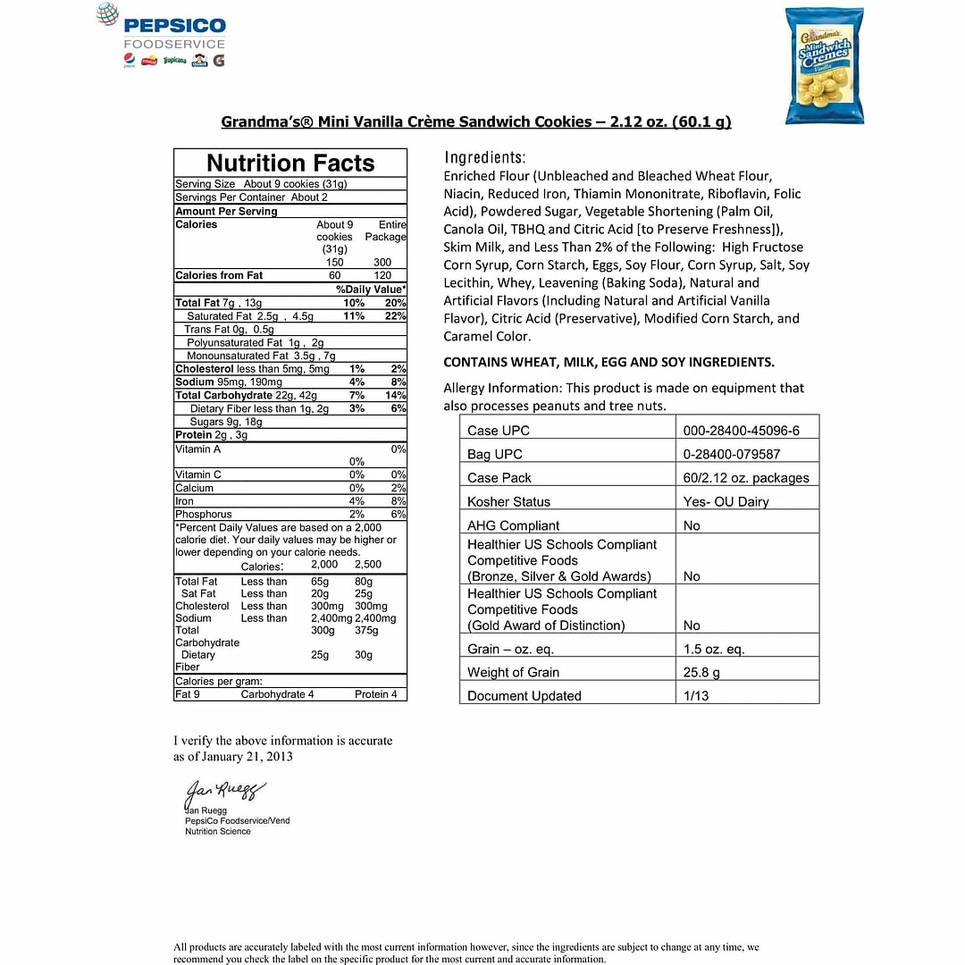 Grandma’s® Mini vanilla creme cookies have a delicious taste, sold in 2.12 oz bag with 60 bags per box.