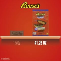 Contains one (1) 41.25-ounce, 75-piece bulk variety bag of REESE’S Halloween Lovers Milk Chocolate and White Creme Assortment Snack Size Cups Candy