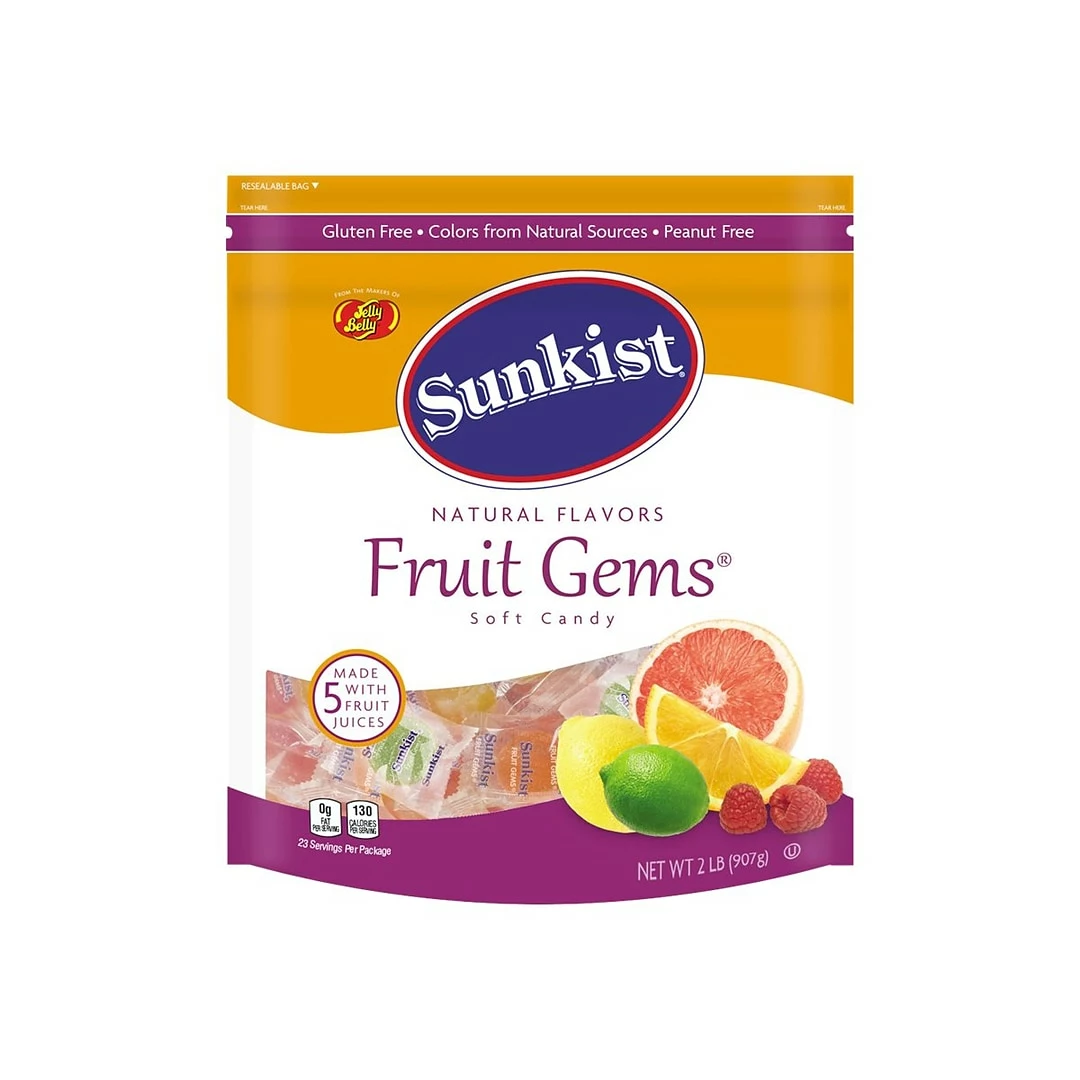 Keep your sweet tooth satisfied with a pouch of Jelly Belly Sunkist Fruit Gems. The large 2-pound bag, colors from natural sources and five juicy flavors make individually wrapped Jelly Belly Sunkist Fruit Gems a tasty treat that can be shared.