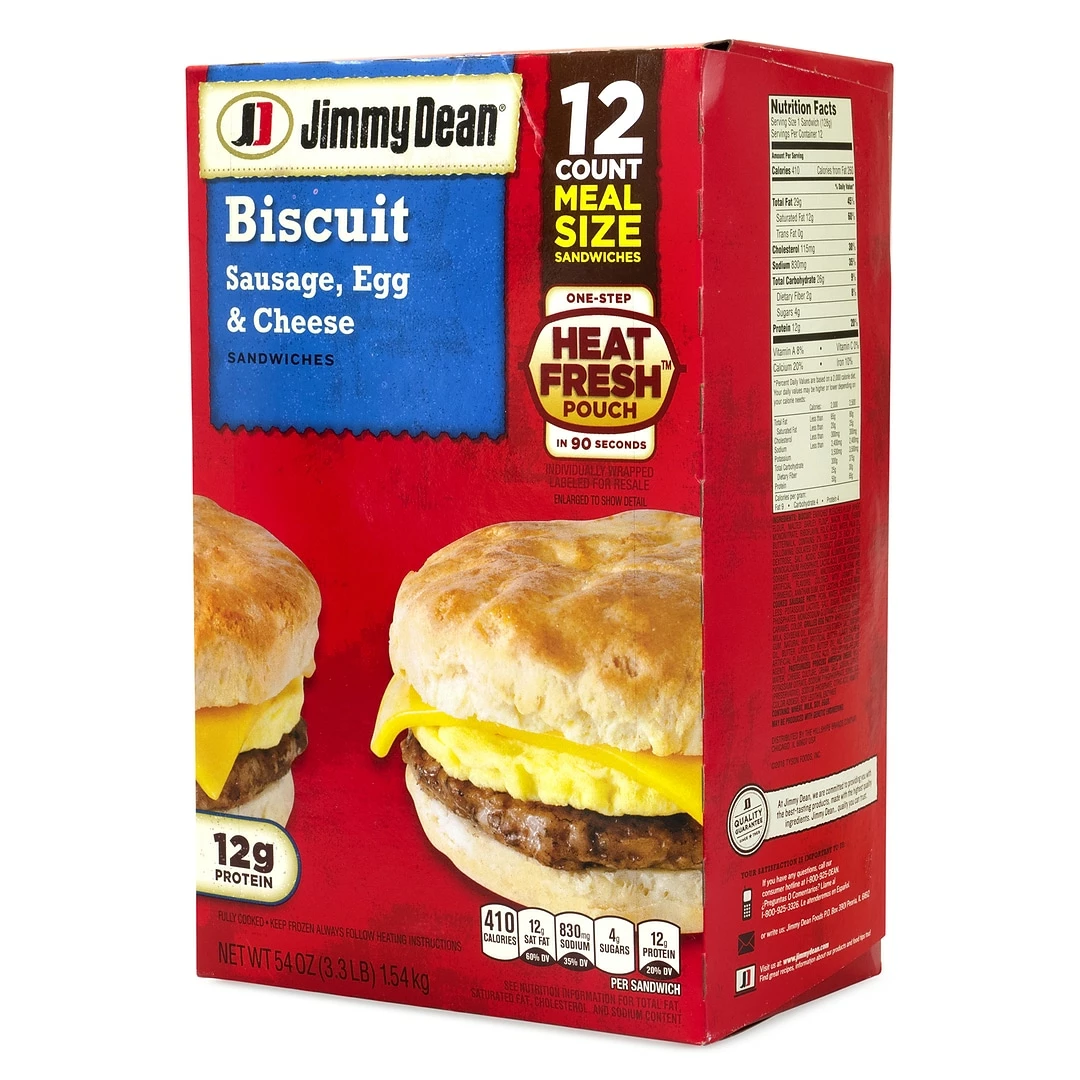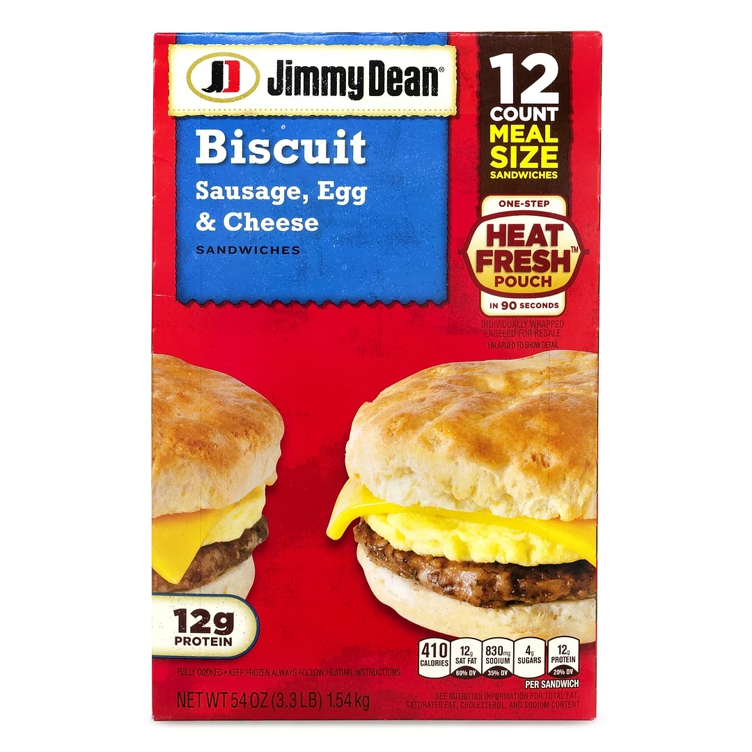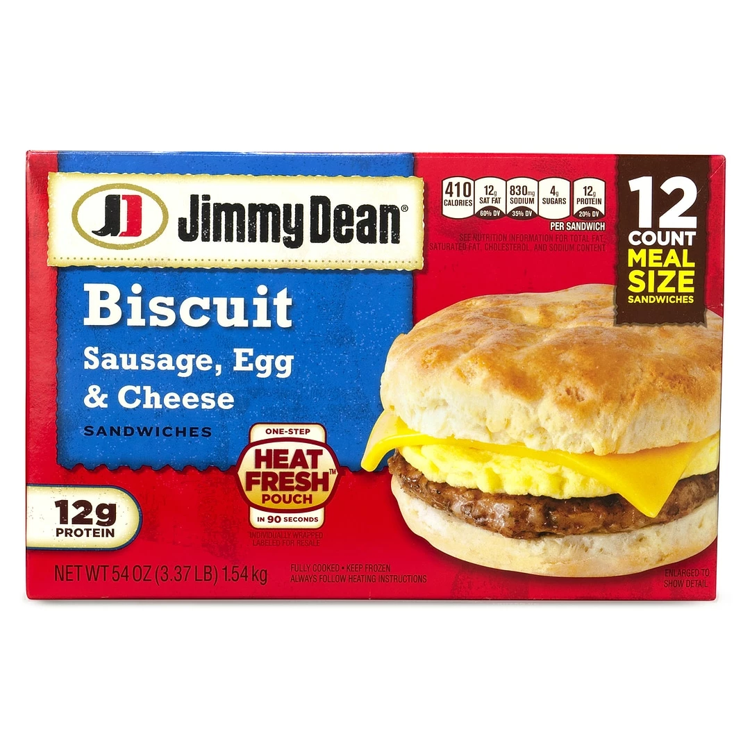 A 12 pack box of Jimmy Dean Sausage, Egg, and Cheese Biscuit Sandwiches