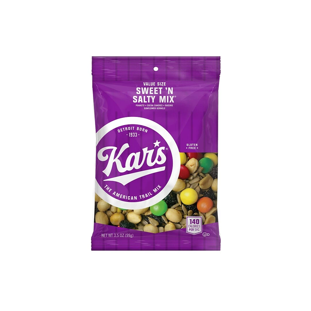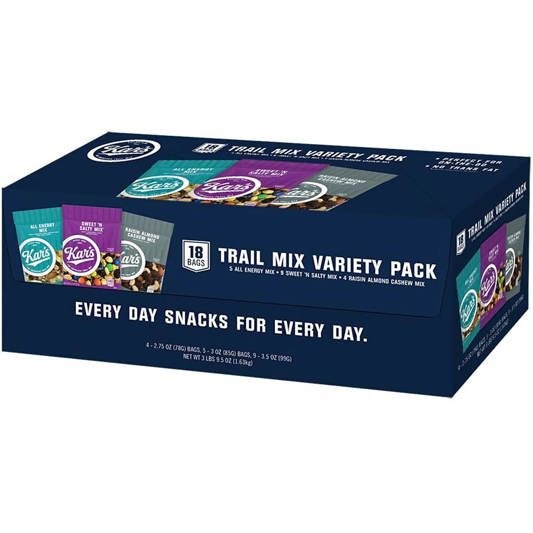 Satisfy the taste buds with this trail mix pack. The sweet and salty variants offer an indulgent treat, while all-energy and raisin almond cashew flavors are unsalted for a healthier option. This Kar’s trail mix assortment pack comes in a box of 18 pouches for lasting supply in a workplace, vending machine or party.
