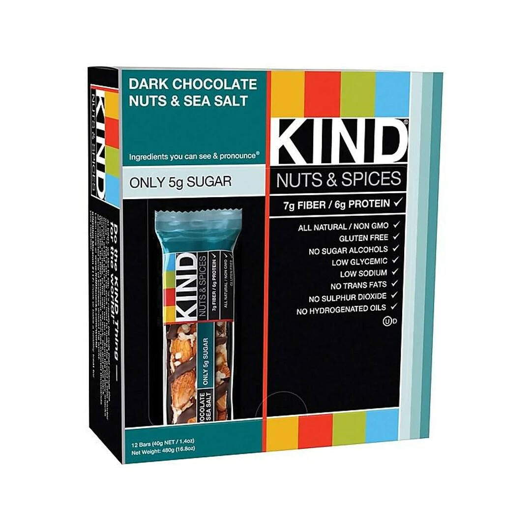 Let employees and guests indulge in a high-protein treat with this box of 12 KIND dark chocolate nuts and sea salt bars.