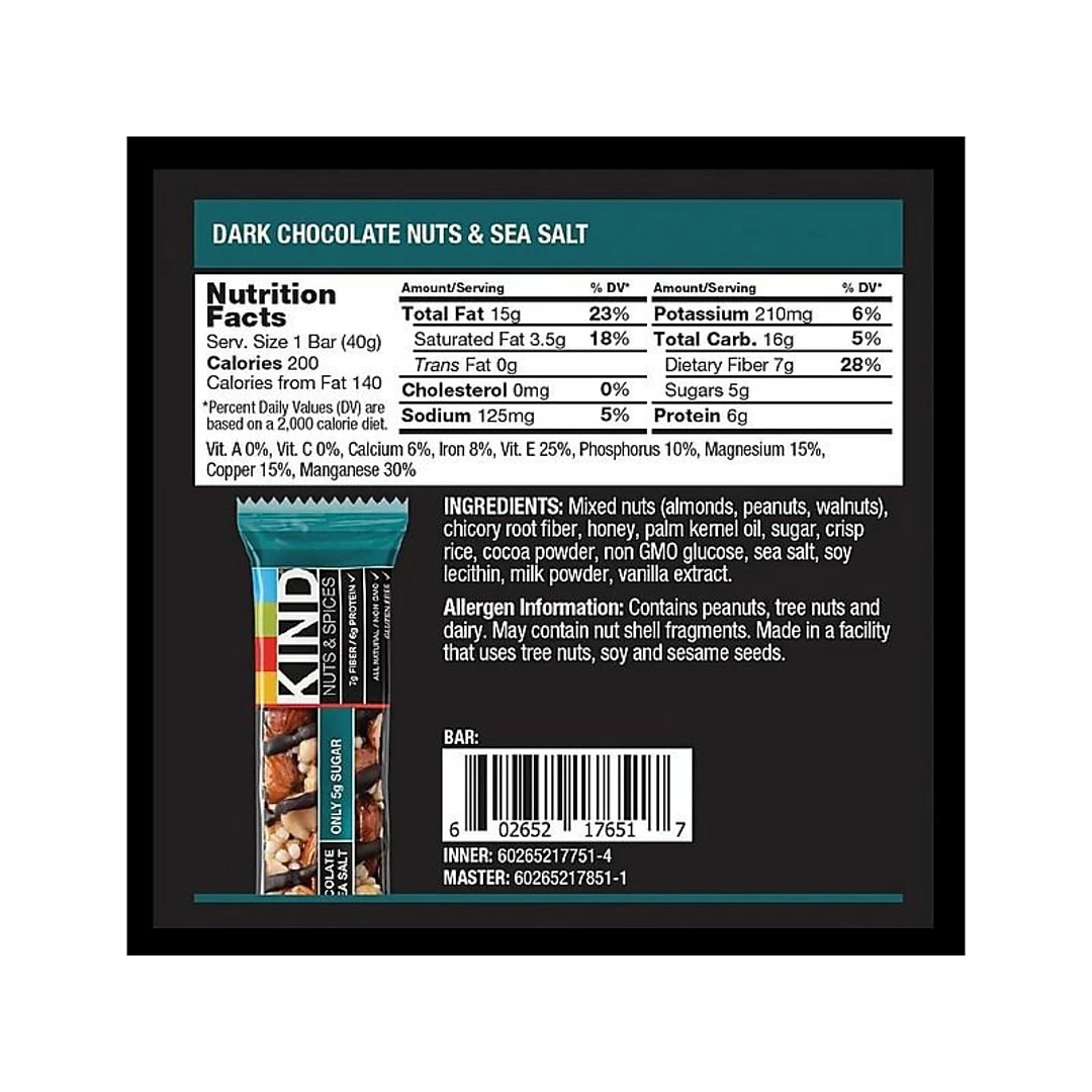 | Customizable : No | Fat Free : No | Flavor : Dark Chocolate Nuts & Sea Salt | Gluten Free : Yes |