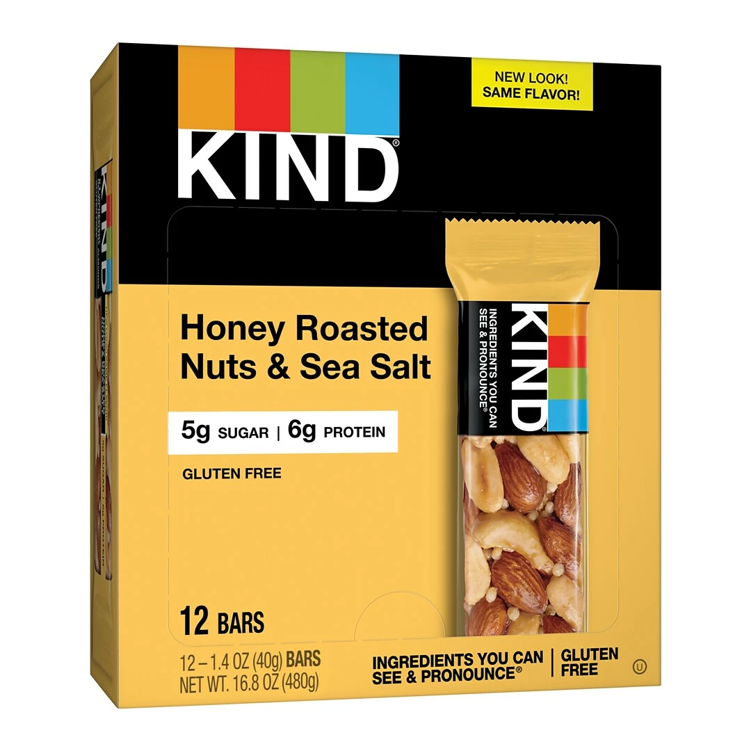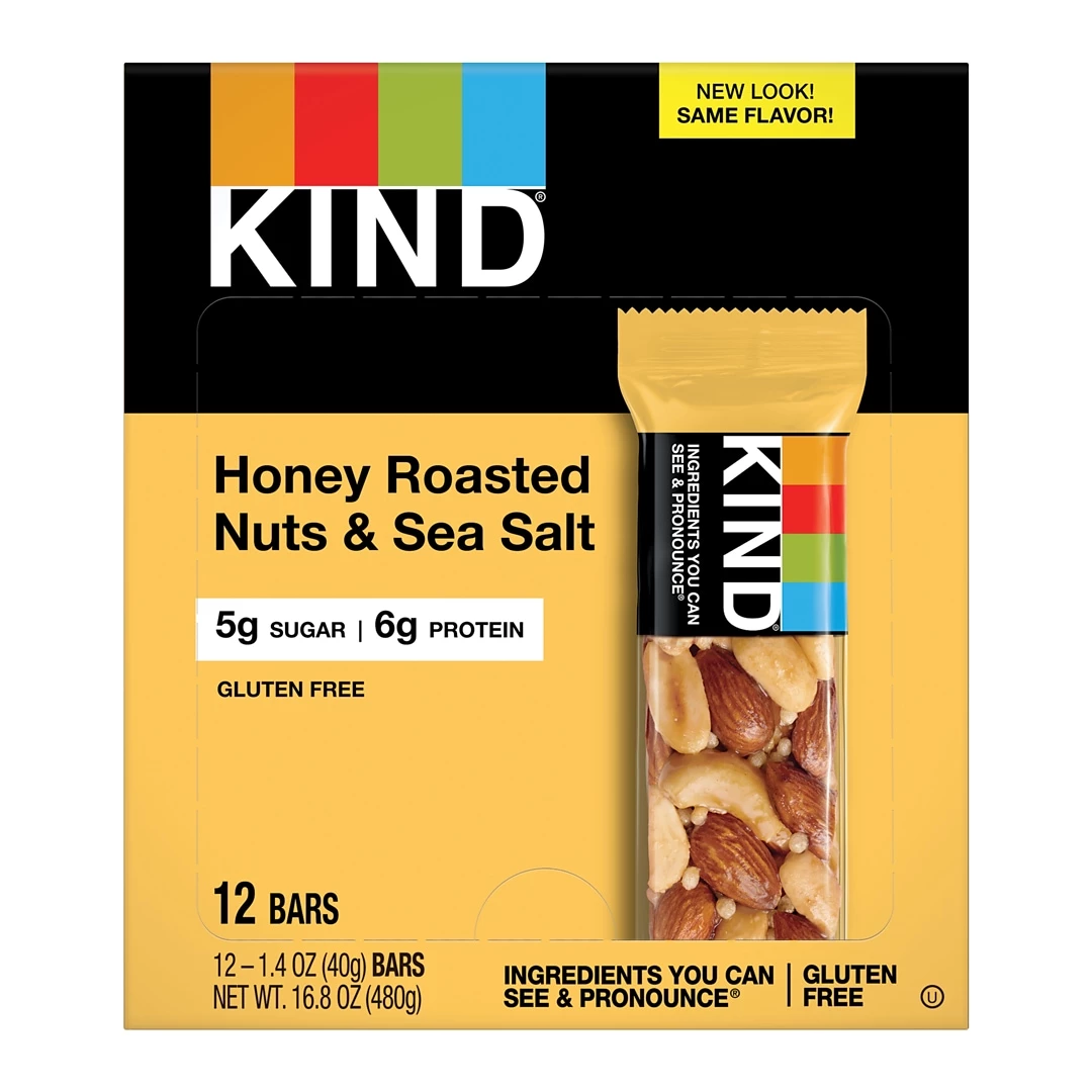 Satisfy hunger with these KIND nuts & sea-salt honey roasted bars. Each 1.4-oz. bar is high in fiber and a good source of potassium with no cholesterol. These KIND nuts & sea salt bars come in a box of 12 and are great for breakfast or to snack on anytime you’re craving a delicious treat.