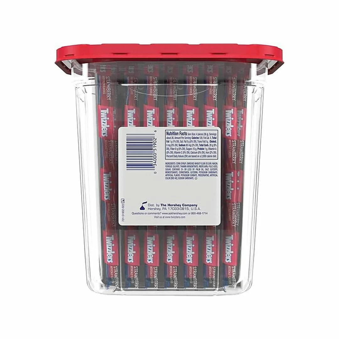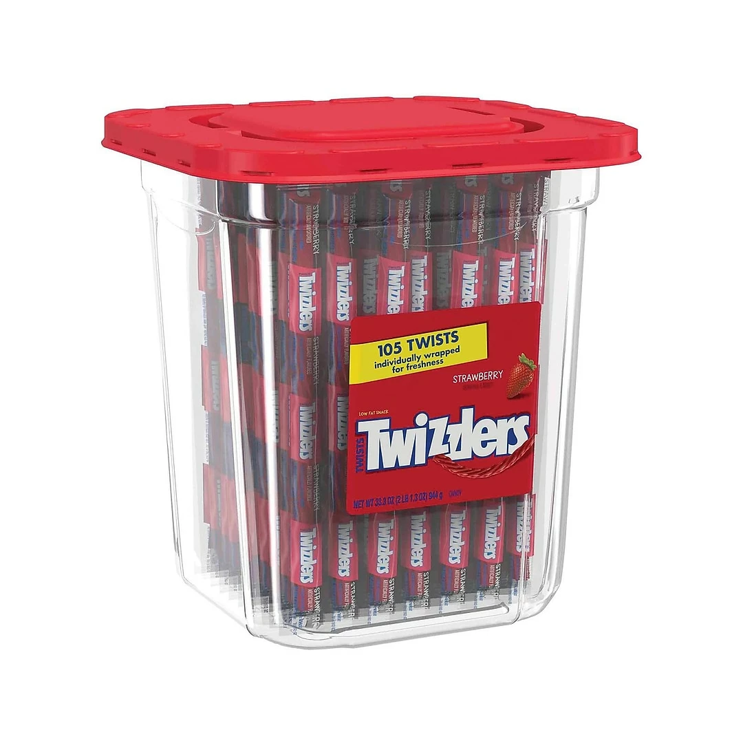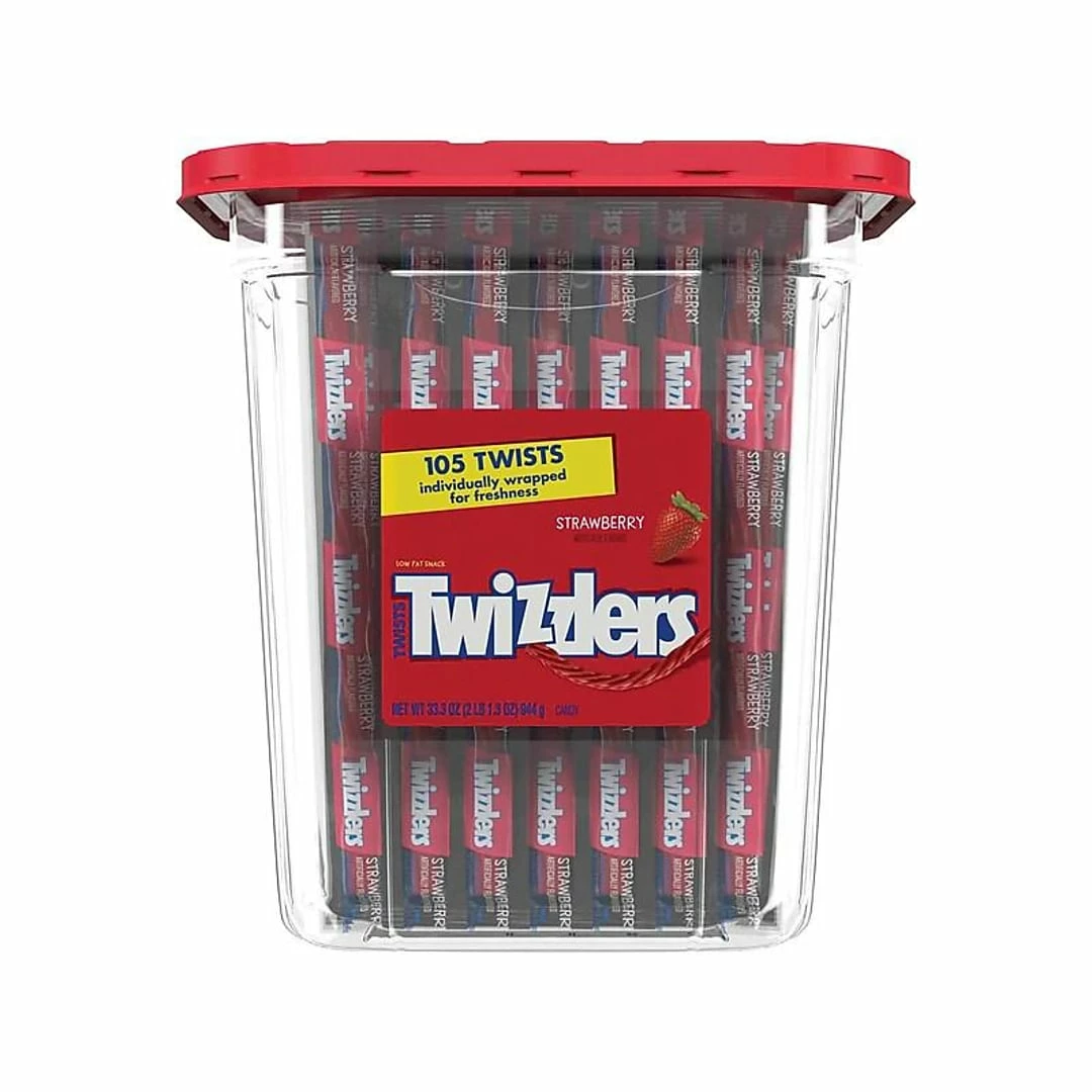 Snack throughout the workday with these fruity, sweet twists. The soft texture makes these treats chewable, while the strawberry flavor provides a mouth-watering, long-lasting taste that keeps you going. These Twizzlers twists are individually wrapped for added convenience and come in a 33.3-ounce canister, so you have more than enough to stock up the break room or share with co-workers.