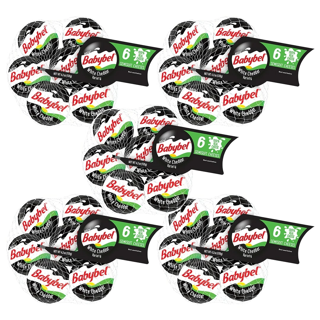 5 bags of Mini Babybel White Cheddar Cheese with 6 pieces in each bag for a total of 30 mini cheeses.