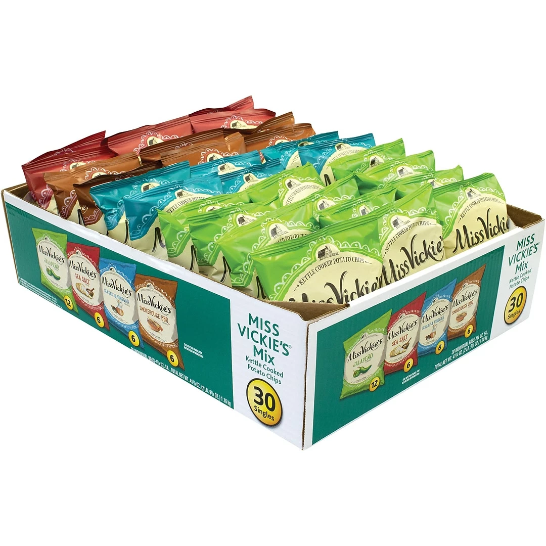 Looking for a crisp, delicious snack in excitingly different flavors? Miss Vickie’s Kettle Cooked Mix, 30 Count has everything you’re looking for. With 12 Jalapeno, 6 Sea Salt and Vinegar, 6 Smokehouse BBQ, 6 Original Recipe, this 30 count box will last a long time. Perfect for the employee breakroom, or for storing at home and bringing some with lunch for the day. Miss Vickie’s Kettle Cooked Mix, 30 Count is a great change of pace from regular chips!