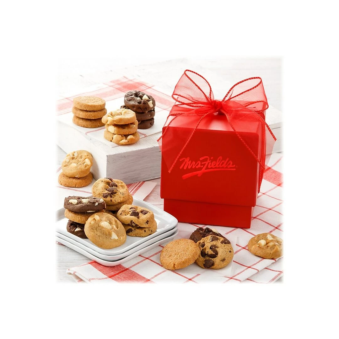 Introducing the Crimson collection: the Mrs. Fields sophisticated Crimson cookie mini box contains 24 Nibblers bite-size cookies. The cookies feature four signature flavors: semisweet chocolate chip, cinnamon sugar, triple chocolate, and white chocolate macadamia nut. The bite-size cookies come three per package and sealed to preserve out-of-the-oven freshness, making them a perfect one-bite treat.