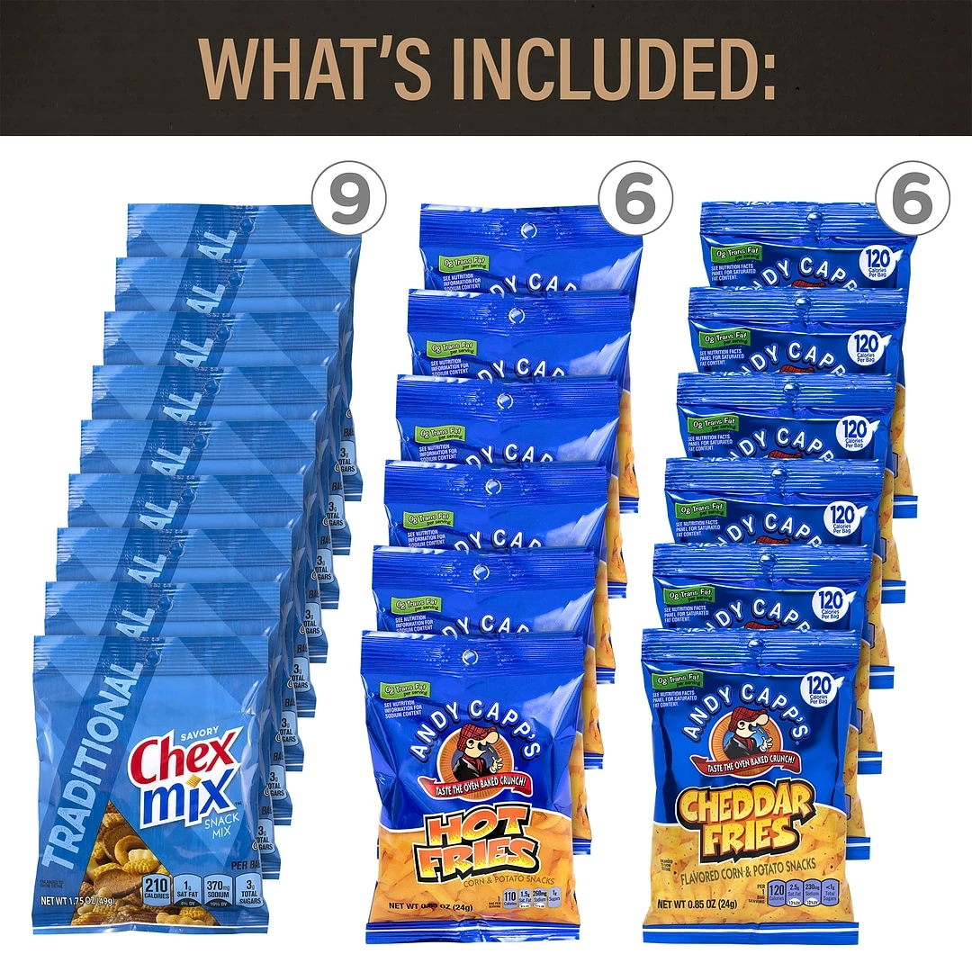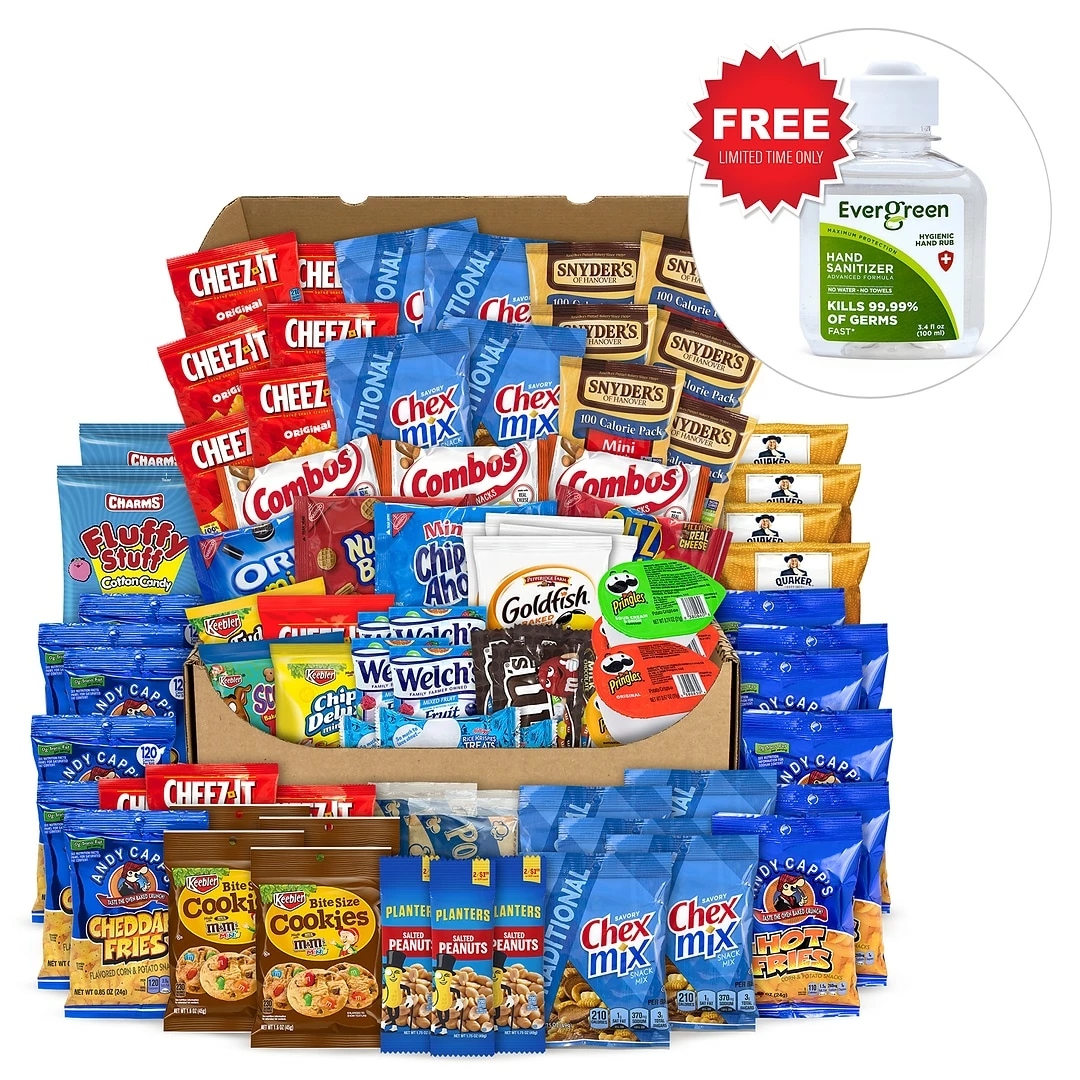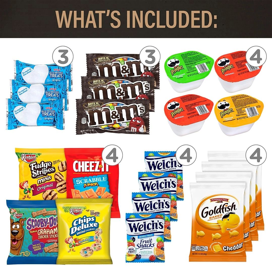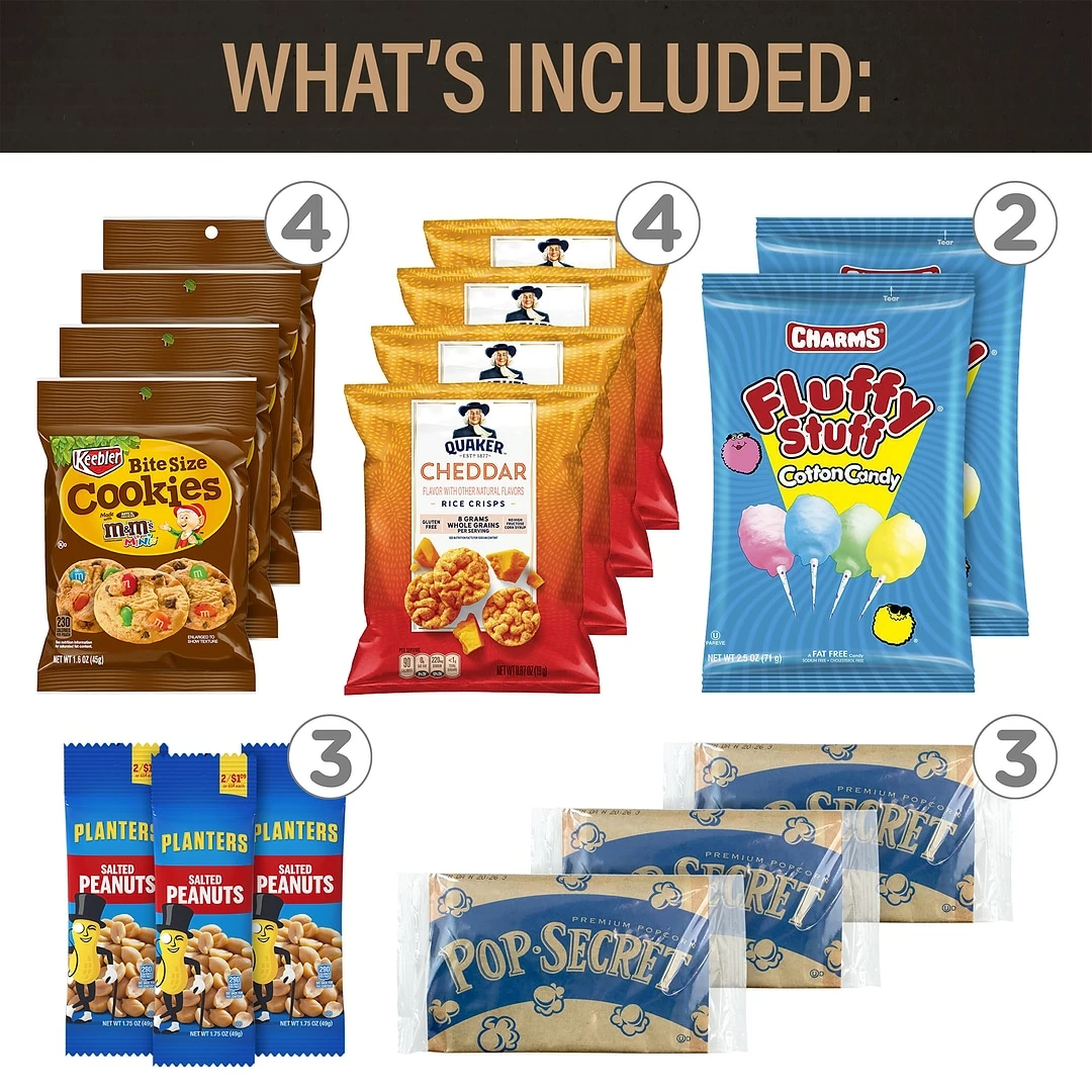 Welch’s Fruit Snacks, M&M’s, Goldfish, Nabisco Cookies and Crackers, Cheez Its, Pringles, Combos, Chex Mix, Rice Krispies, Snyder’s Pretzels, Cotton Candy, Party Mix, Herr’s Popcorn, Planters Peanuts, Andy Capps Fries, and M&M Cookies