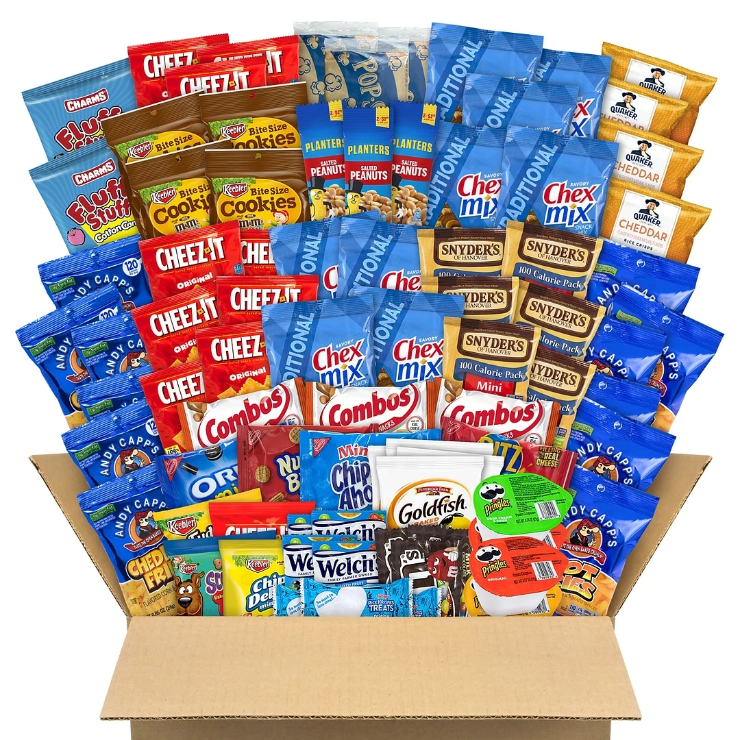 A box filled with 75 Party Snacks in a variety of types and flavors