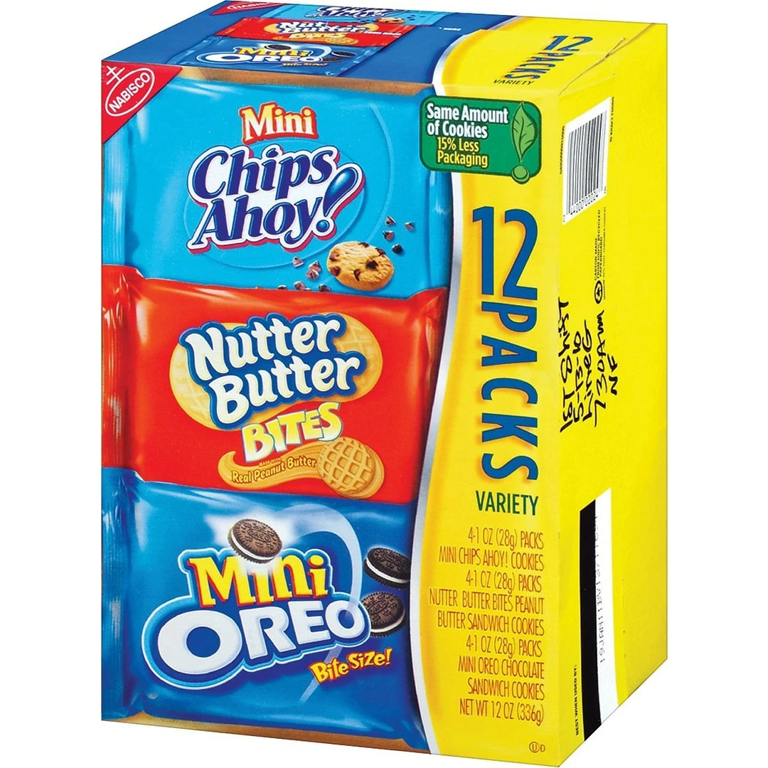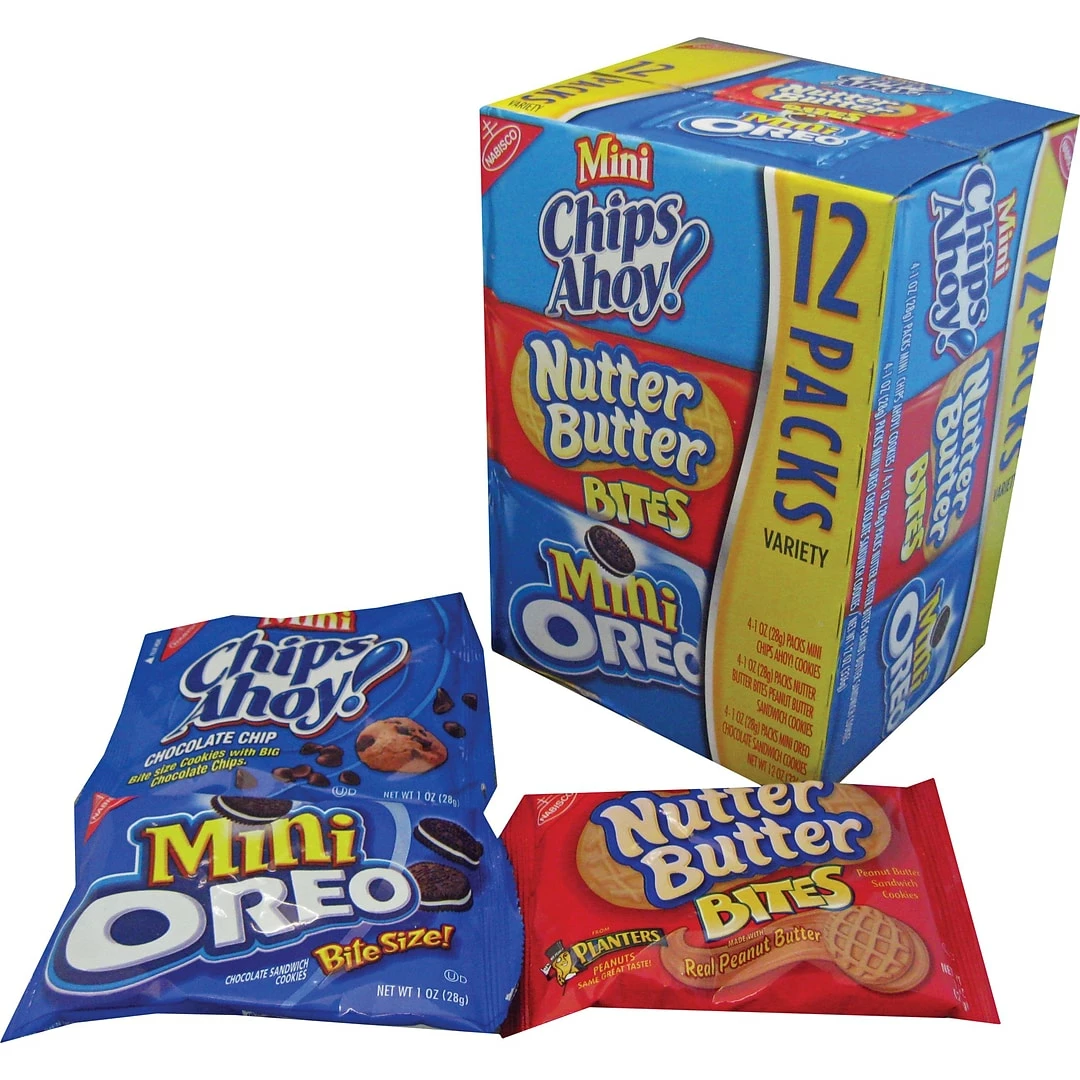 Nabisco® Mini cookie variety pack contains Mini Chips Ahoy!, Mini Oreos and Nutter Butter Bites.