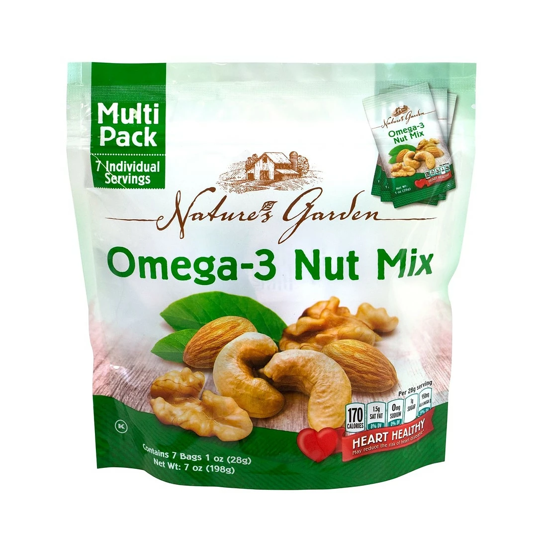 Snack healthy with this Nature’s Garden Omega-3 Nut Mix of deliciously crunchy natural nuts. Grab a handful of roasted almonds, cashews, and walnuts and enjoy a great tasting mix that is rich in omega-3 fatty acids. This heart-healthy mix is also an excellent source of protein, fiber and other vitamins. Nature’s Garden Omega-3 Nut Mix is Cholesterol, Sodium and Kosher. With 6 7-Pouch bags, you’ll have plenty of nut mixes to enjoy!