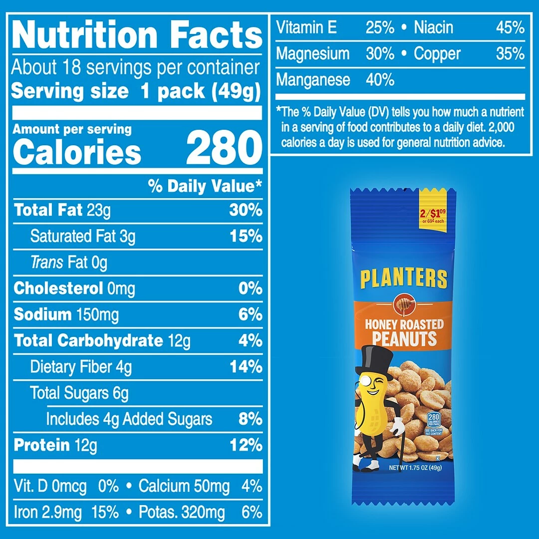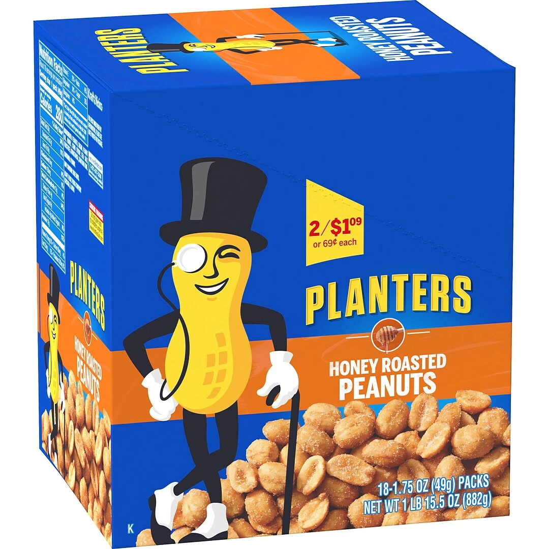 These pouches of peanuts are perfect for eating on-the-go, in between meetings, or when you’re lounging around the house! Planters Honey Roasted Peanuts, 1.75 oz, 18 Count are bursting with deliciously crunchy flavor. Each box contain eighteen 1.75 ounce pouches of Honey Roasted Peanuts. These peanuts are a great alternative to sugary or unhealthy snacks. Planters Honey Roasted Peanuts, 1.75 oz, 18 Count is a must have for the office break room, or packed in your lunch each day for a protein-packed peanut snack!