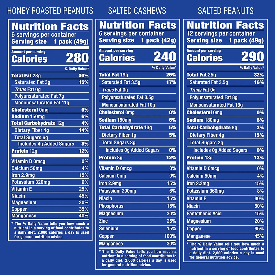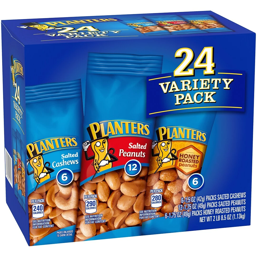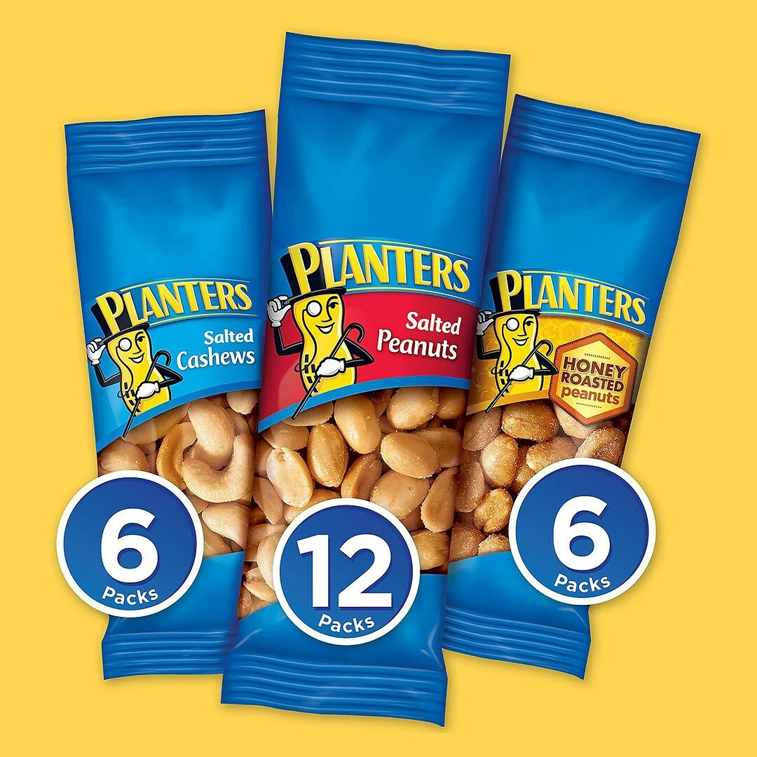 Variety pack contains six packages of salted cashews, 12 packages of salted peanuts, and six packages of honey roasted peanuts