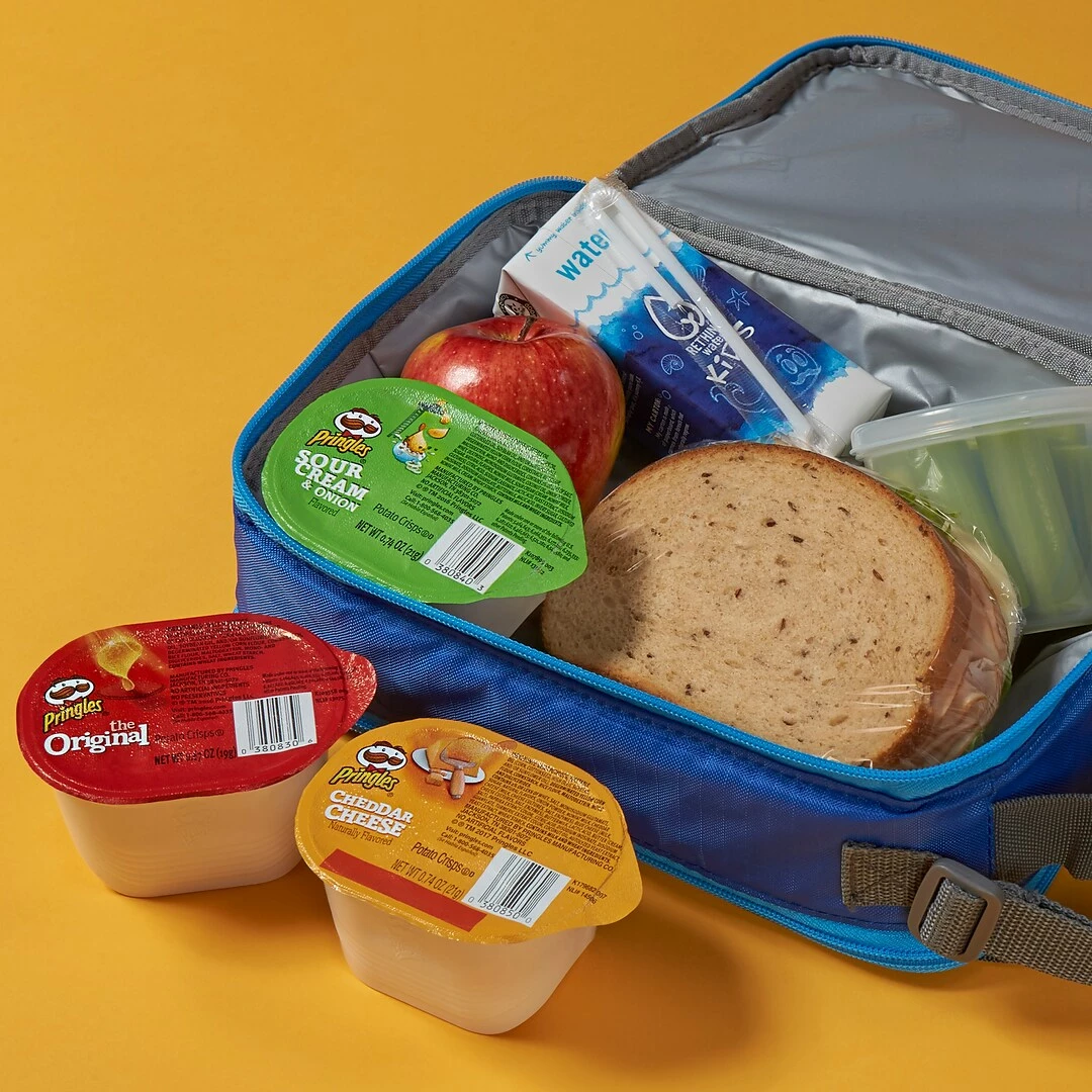 Make everyone happy at lunch or break time with a variety of potato chip packs. This 72-count case includes original, sour cream and onion and cheddar cheese varieties for a well-rounded snack cabinet. These Pringles Snack Stacks potato chip snack cartons protect the food within, so you enjoy large crisps instead of crunched bits.