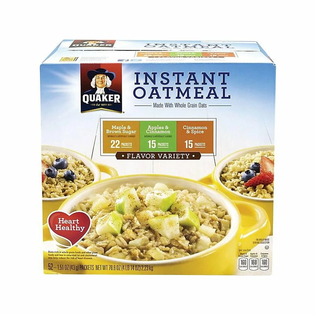 Keep this 52-count Quaker instant oatmeal variety box in your home or office for a range of tasty and heart-healthy breakfast options.