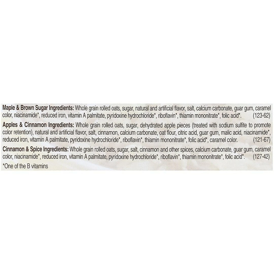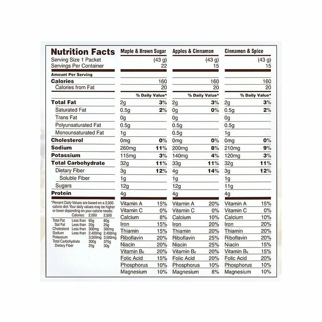 Variety pack contains 22 maple and brown sugar oatmeal, 15 apples and cinnamon oatmeal, 15 cinnamon and spice oatmeal
