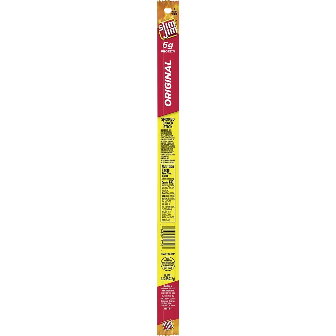 When it comes to snack foods, they say size matters. That’s why Slim Jim Giant Original Flavor Smoked Meat Stick has a big, meaty flavor for the ginormous meat-lover in you. With 6 grams of protein in each serving, these tasty meat snack sticks easily please your need for beef. They come individually wrapped, so you can enjoy a king-size protein snack anywhere you want. Satisfy your hunger with a Slim Jim Snack Stick that punches your taste buds in the face with a carnivore-pleasing flavor that’s not like those other beef sticks or beef jerky imposters. So, go ahead and fill your kitchen pantry. Snap into a Giant Slim Jim Meat Stick, and snack big.