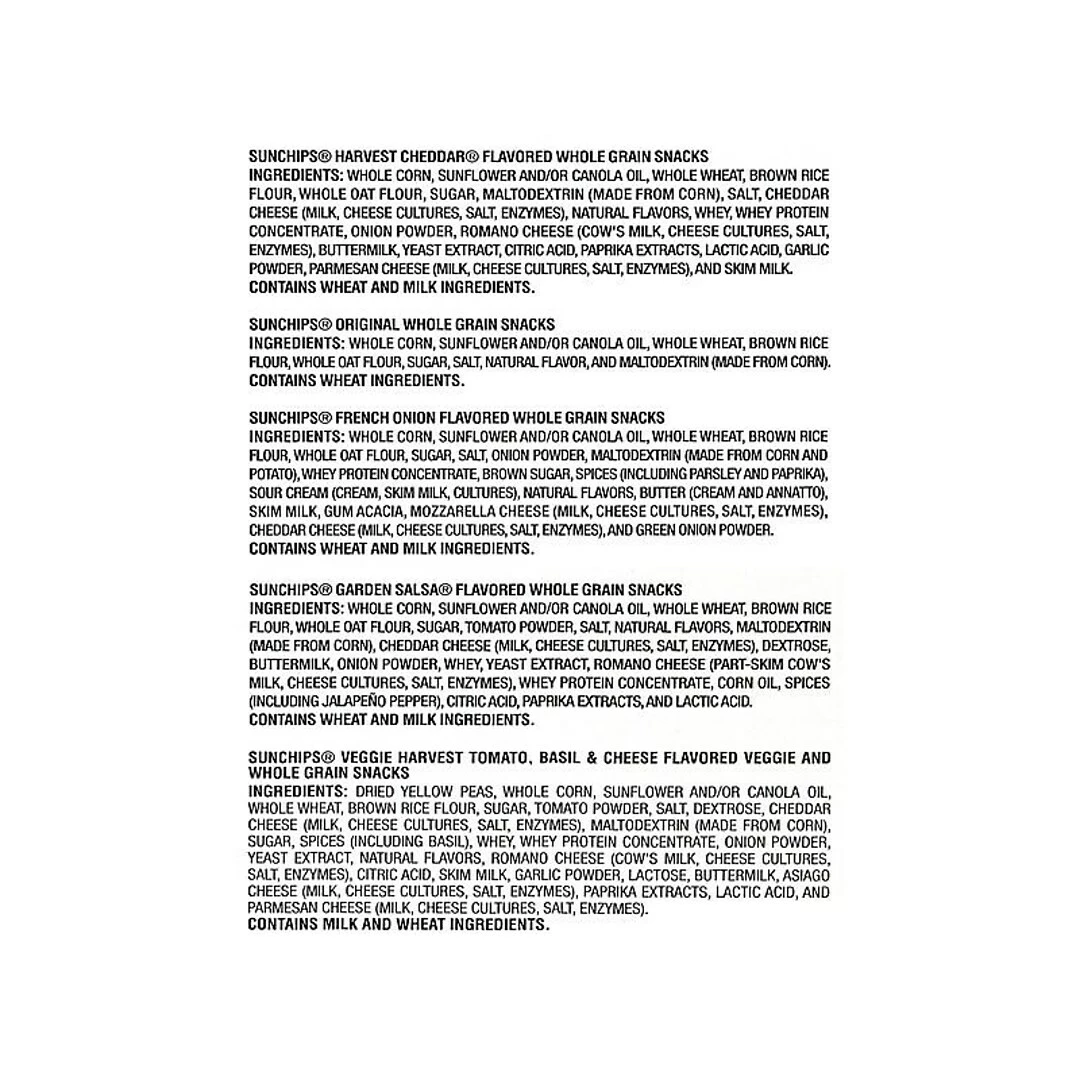 Provide snacks for company picnics, staff meetings, and other events with these bags. With an individually-packaged design, these chips are great for pairing with daily lunches or snacking on during work. These Frito Lay Sunchips variety-pack bags feature four savory flavors and come with 30 to a case, making it easy to stock up the vending machine, concession area, or breakroom.