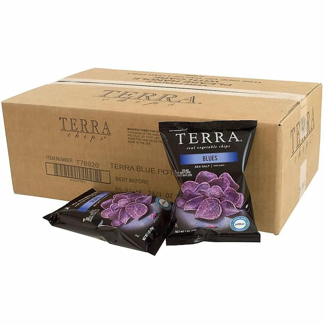 Satisfy afternoon cravings with this 1-ounce bag of vegetable chips. The non-GMO, gluten-free ingredients provide a healthy alternative to vending machine fare, and the vibrant bluish-purple chips are made from real potatoes. This 24-count box of Terra Blues vegetable chips contains a plentiful supply of slightly nutty-flavored snacks to share with friends or co-workers.