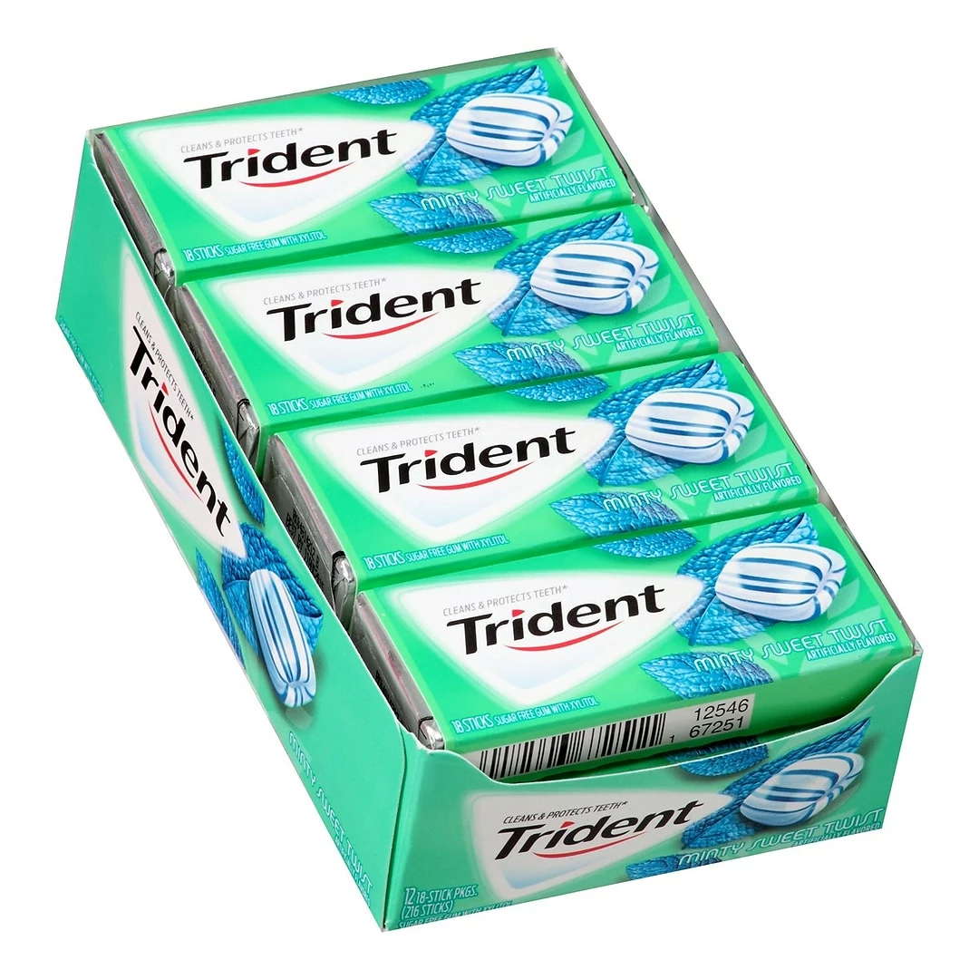 Freshen your breath with the refreshing minty flavor of this Trident Minty Sweet Gum. This 12-Pack has more than enough cooling and sweet gum packs to keep in your car, pocketbook, desk drawer, or at home. Grab a pack of this Sugar-Free Trident Minty Sweet Twist Gum and chew the gum that’s bursting with delicious mint flavor. Clean and freshen your break with this great tasting gum!