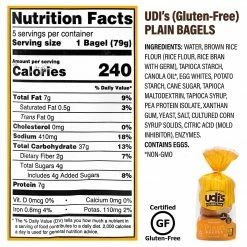A 3-count pack of Udi’s plain bagels. UDI’s bagels are made gluten free and are always soft and chewy. Buy in bulk, keep stored in the freezer, and have delicious bagels on hand at any time. Pair with your favorite cream cheese or egg sandwich combo. Pack in the kids lunches or break out at breakfast to get the whole family excited.
