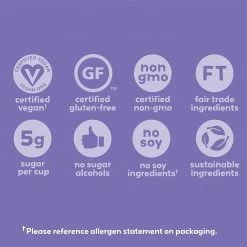 All-natural: our cups are Non-GMO Project Verified and made in small batches with Fair Trade Certified Ingredients. Our palm oil is RSPO Certified Sustainable.