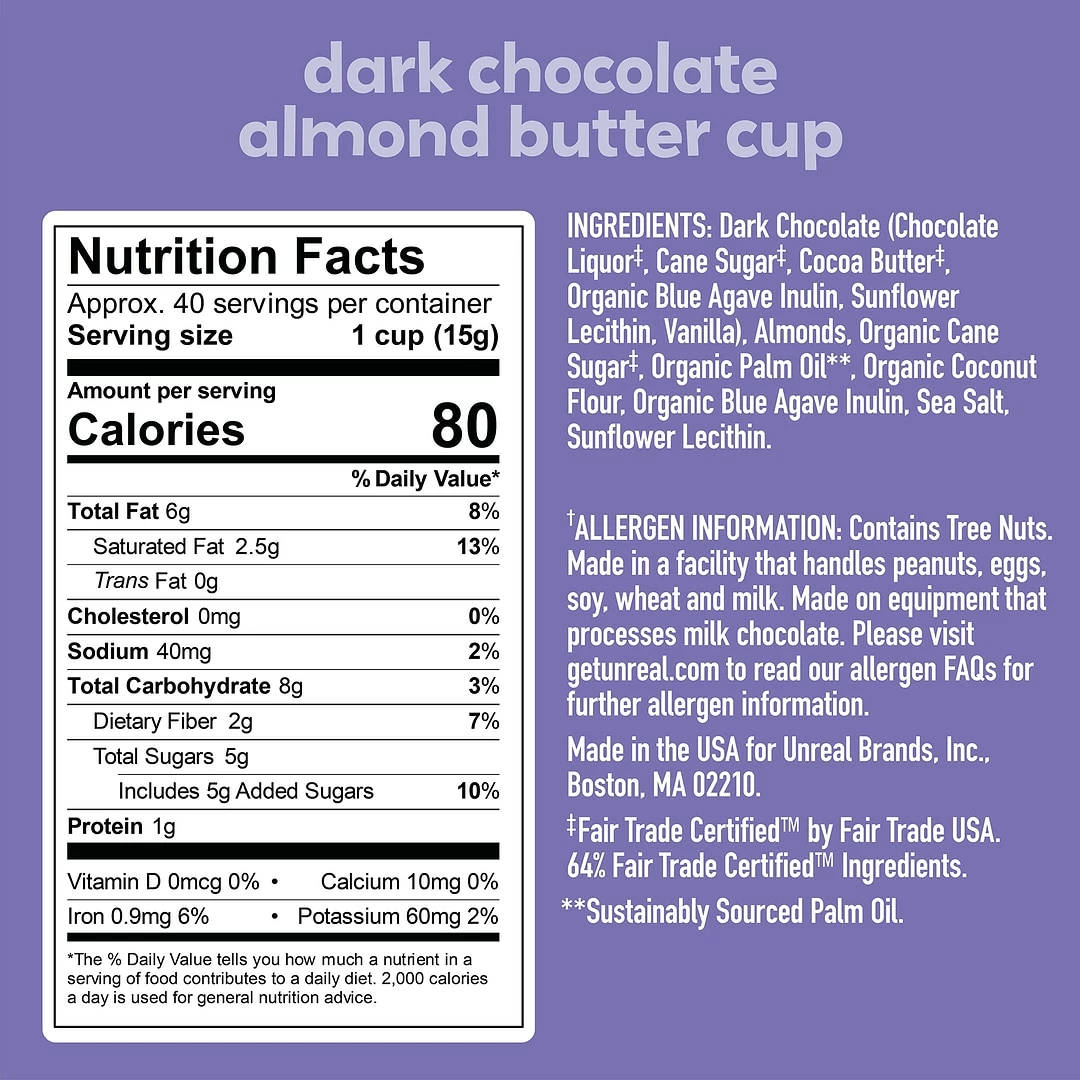Unreal Dark Chocolate Almond Butter Cups, 0.53 Oz., 40 Ct.