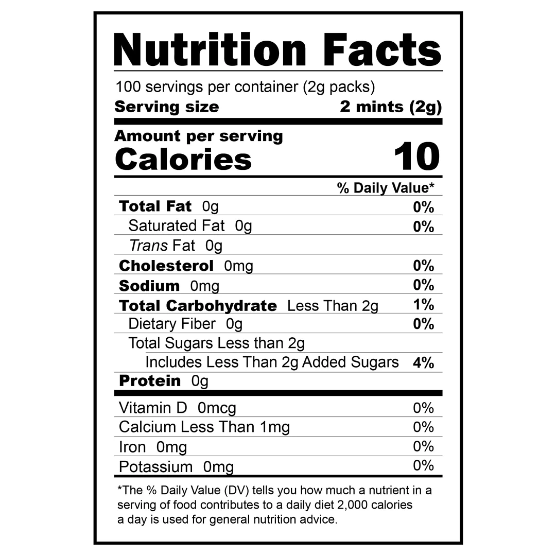 Box contains 100 individually wrapped mint packs (two mints per pack)