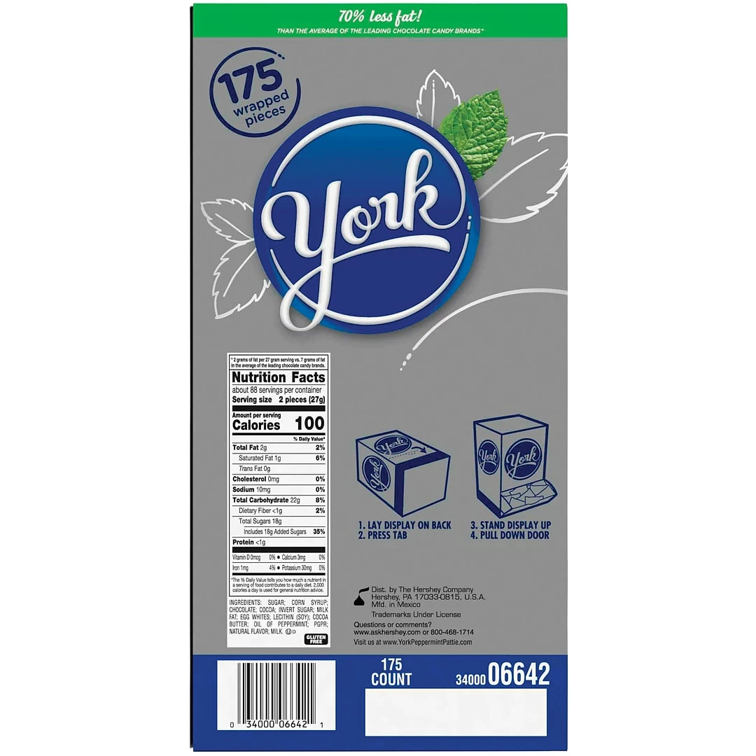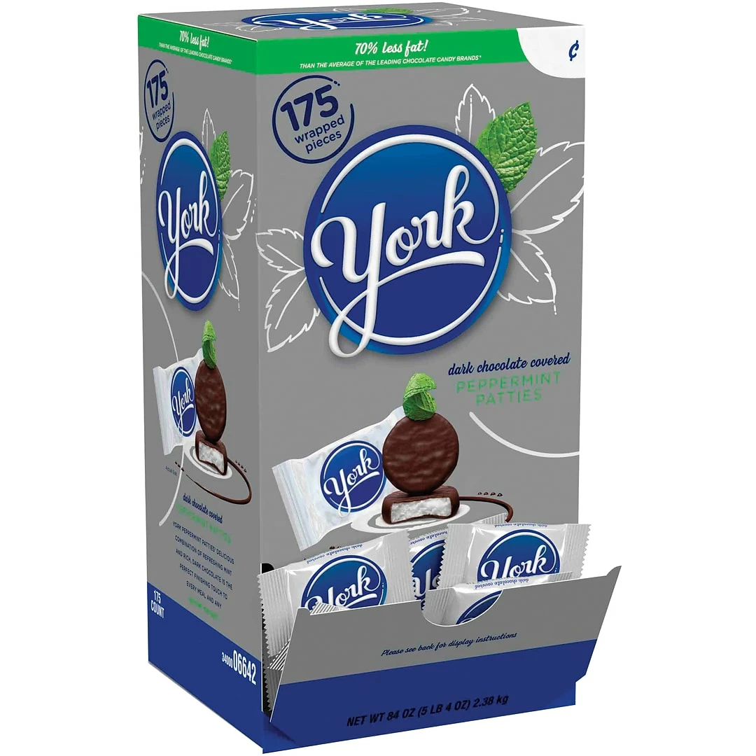 Display these treats on a countertop, front desk, or break room table to give everyone the refreshing taste of peppermint and dark chocolate. This box contains 175 individually wrapped York Peppermint Patties so every guest and employee can enjoy a soft, fresh treat.